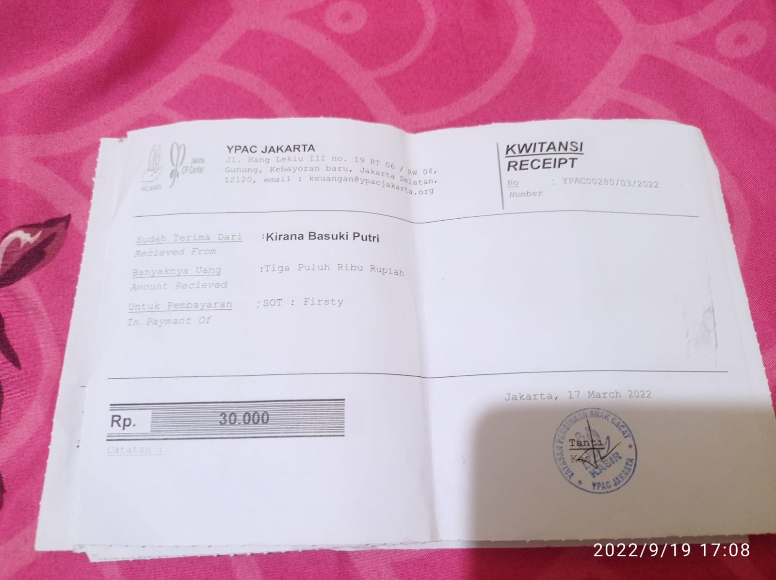 Berikut kami sertakan kwitansi pembayaran terapi untuk pencairan dana terakhir sebesar Rp 150.000. Mohon doa dan bantuannya ya TemanBaik supaya pengobatan Kirana berjalan dengan lancar dan Kirana bisa cepat sembuh. Kami juga mau mengucapkan terima kasih banyak kepada TemanBaik semua dan yang tergabung di BenihBaik.com atas doa dan donasinya untuk Kirana.