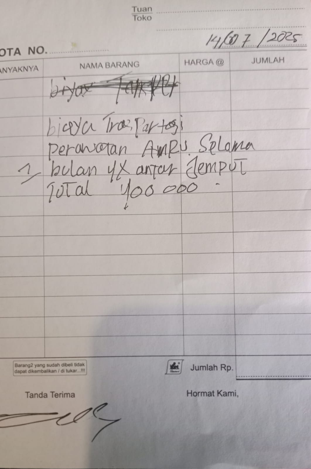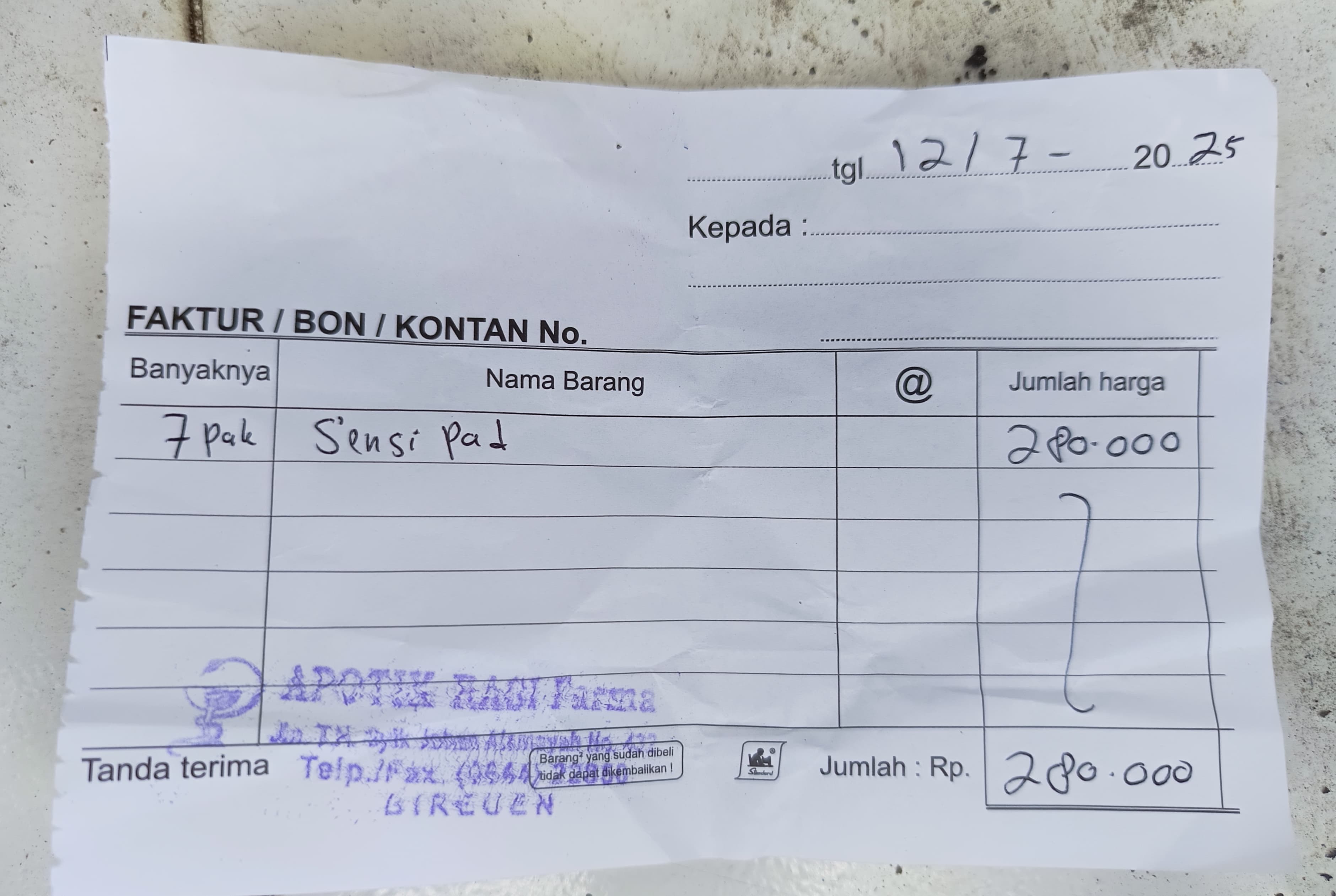 Underpad (7 box x Rp30.000) = Rp210.000