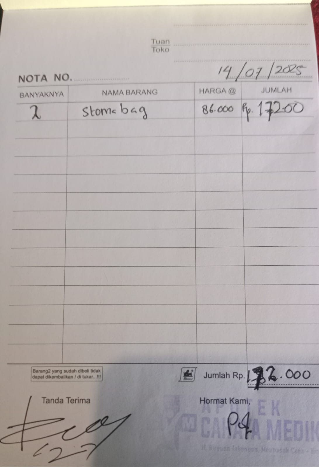 Kantong stoma (2 pcs x Rp86.000) = Rp172.000