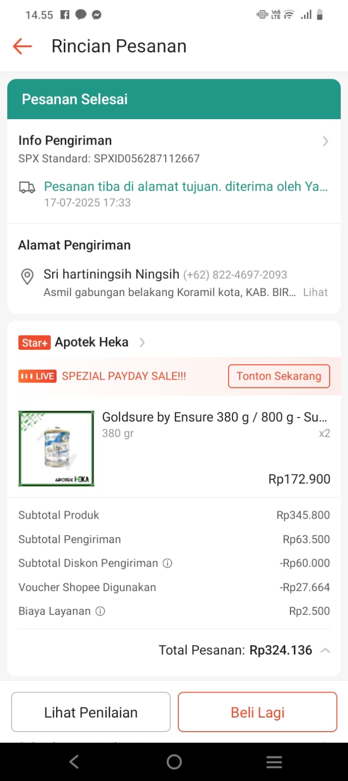 Susu Ensure (2 kaleng) = Rp324.136