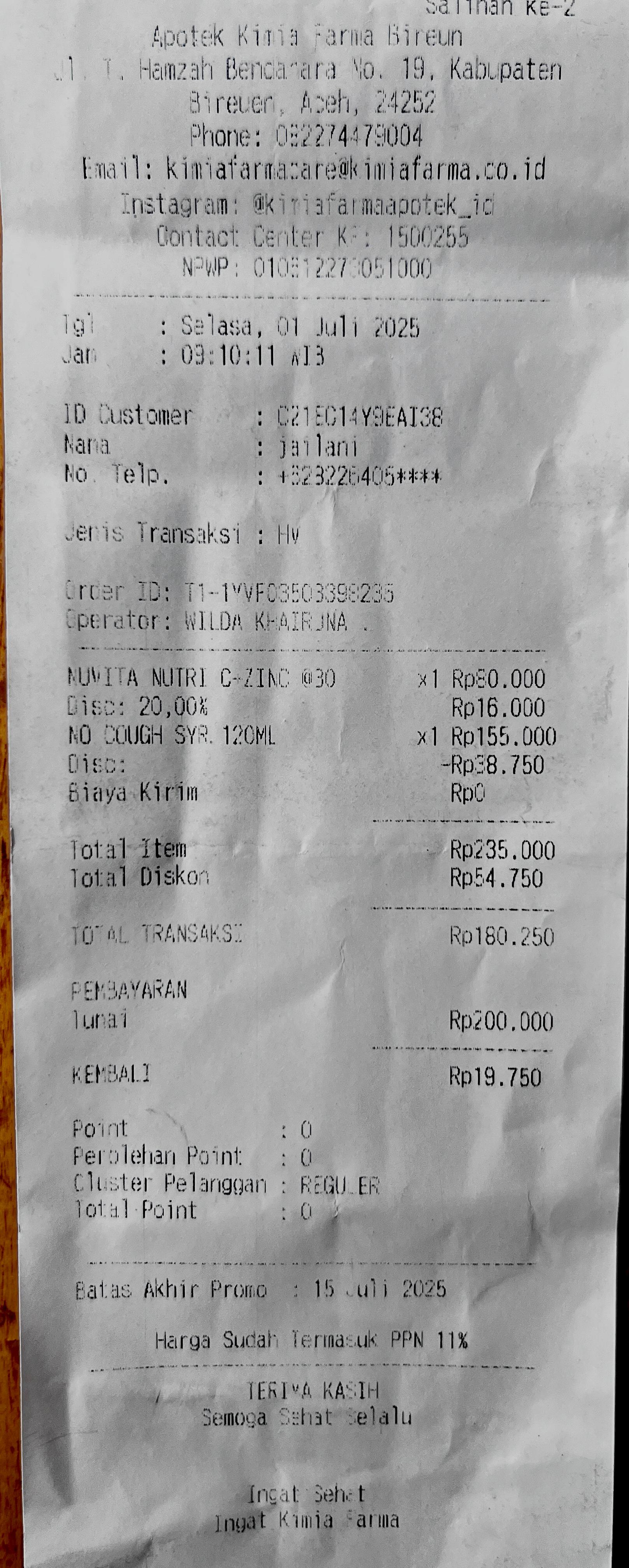 Dana digunakan untuk 1. Susu Peptamen Rp343.000 2. Salap Sanoskin-OXY Rp604.000 3. Nutrimax vitamin D3 Rp175.000 4. Obat batuk No Dough SYR 120 ML Rp155.000 5. NUVITA Nutri C-Zing Rp 60.0002025-07-10 10:24:18