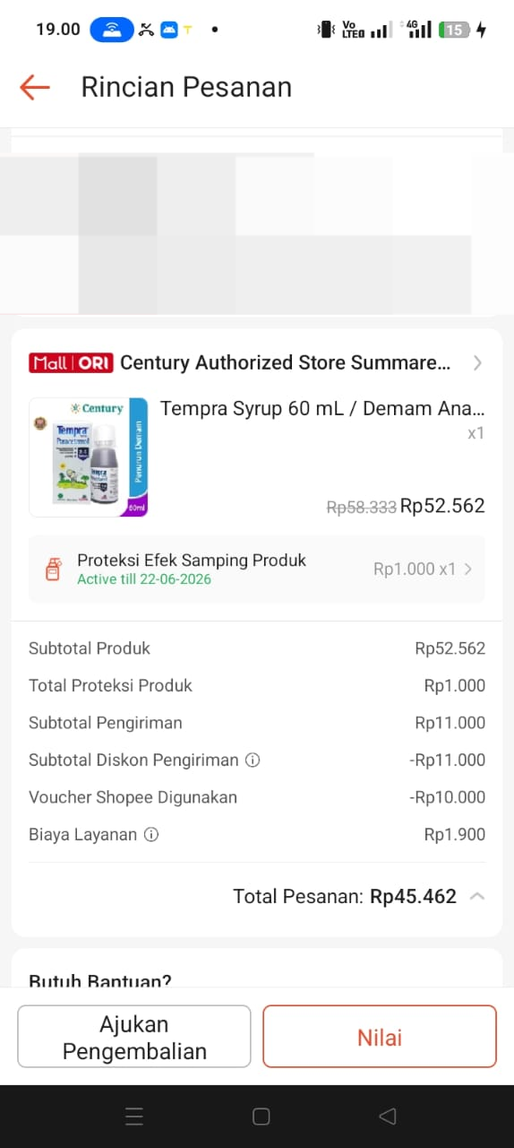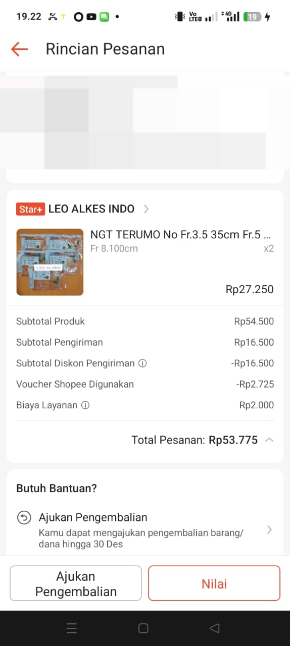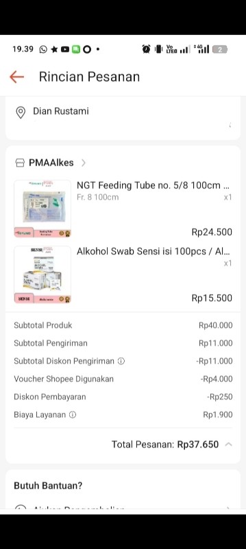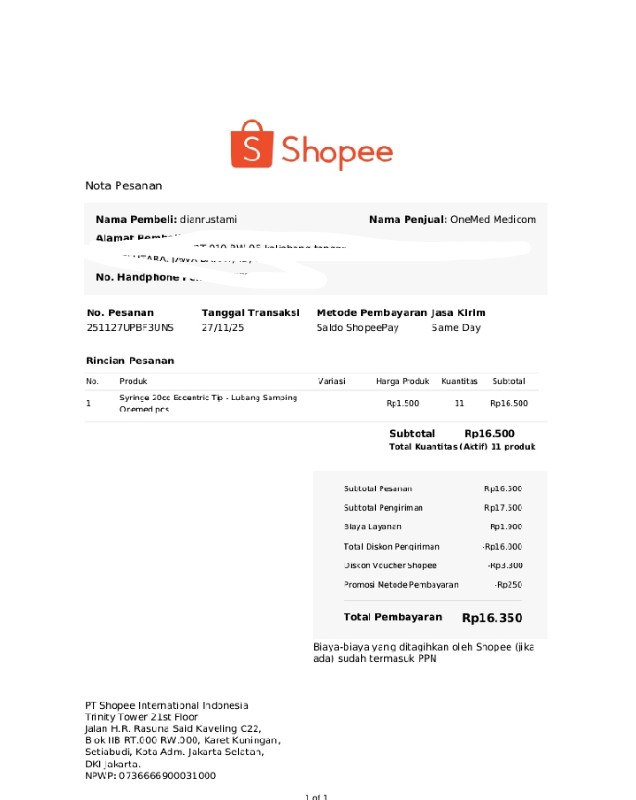 (Rp 407.850 x 3) = Rp 1.223.550 → setelah diskon menjadi Rp 1.185.250Pembelian spuit/syringe 20 cc: Rp 16.350