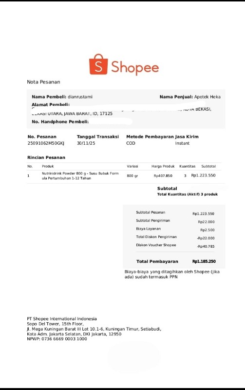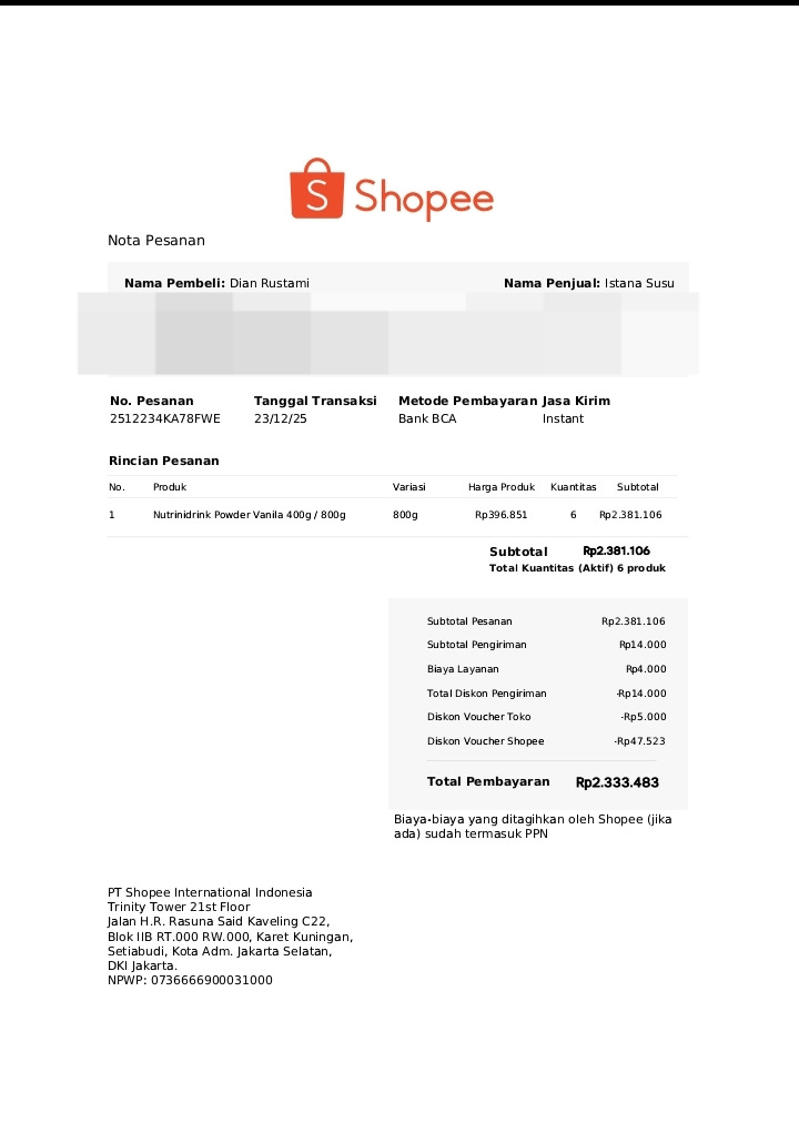 Pembelian susu Nutrinidrink 800 gr sebanyak 3 kaleng: