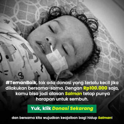 #TemanBaik, tak ada donasi yang terlalu kecil jika dilakukan bersama-sama. Dengan Rp100.000 saja, kita bisa jadi alasan Salman tetap punya harapan untuk sembuh. Yuk, klik Donasi Sekarang dan bersama kita wujudkan keajaiban bagi hidup Salman!