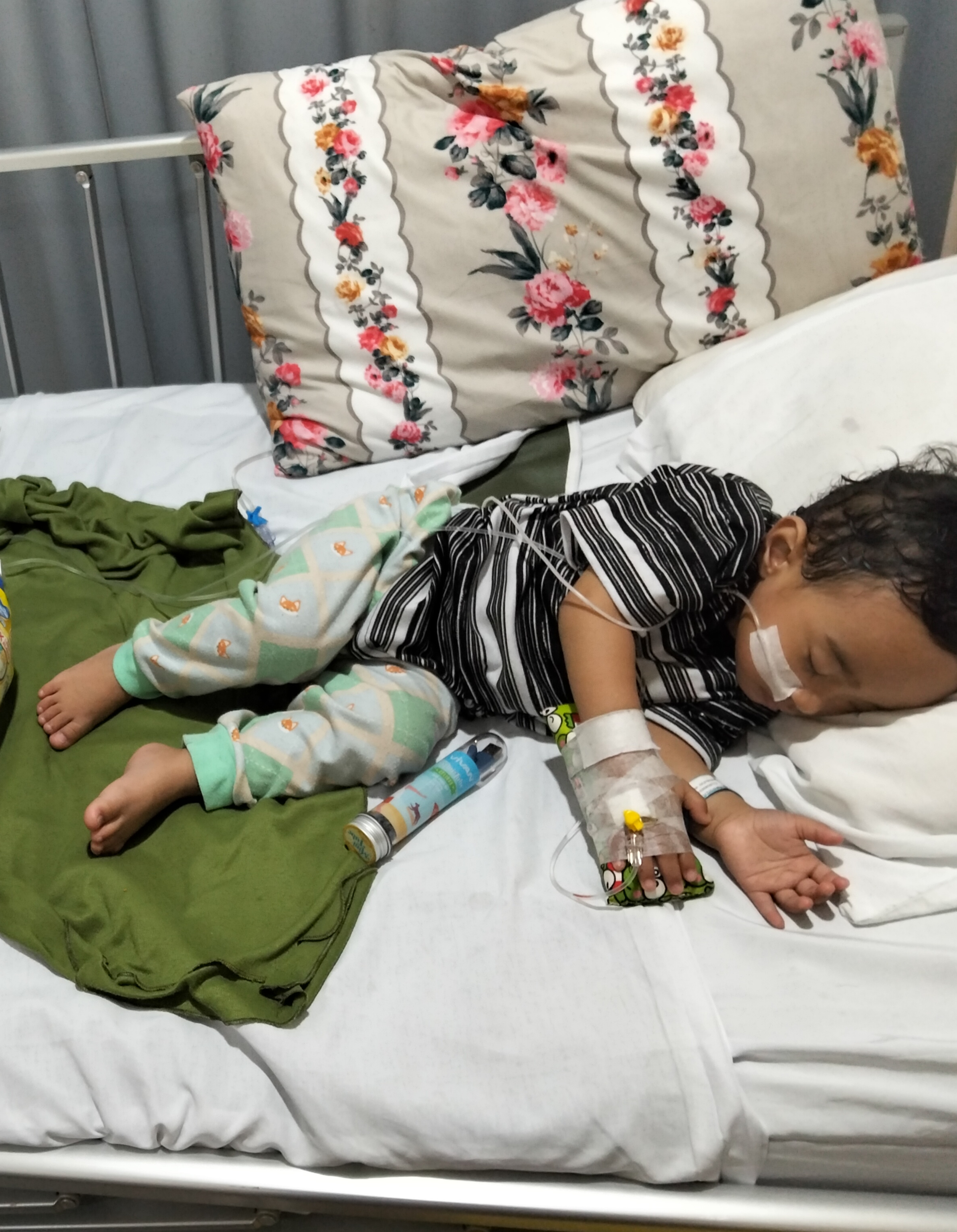 Seiring berjalannya waktu, penyakit anakku justru bertambah. Anakku divonis gizi buruk karena tubuhnya yang lemah selalu disertai demam, muntah, dan dehidrasi. Ia harus makan dan minum melalui selang NGT yang dimasukkan dari hidungnya, karena setiap makanan yang masuk selalu Ia tolak.