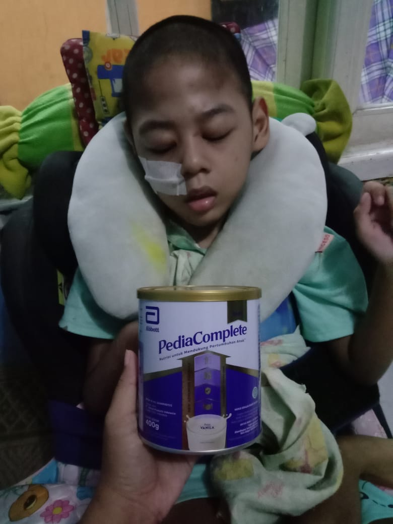 Aku mau ngabarin kalau kondisiku masih belum banyak berubah tapi aku masih semangat lho buat ngikutin semua pesan-pesan dari om dokter di rumah sakit. Aku mau sembuh supaya bisa lari-lari main sama semua teman-temanku. Oh iya, aku sudah beli susu juga untuk membantu memenuhi nutrisi tubuh aku, ini pasti juga karena bantuan dari om dan tante ya makanya aku bisa minum susu ini.
