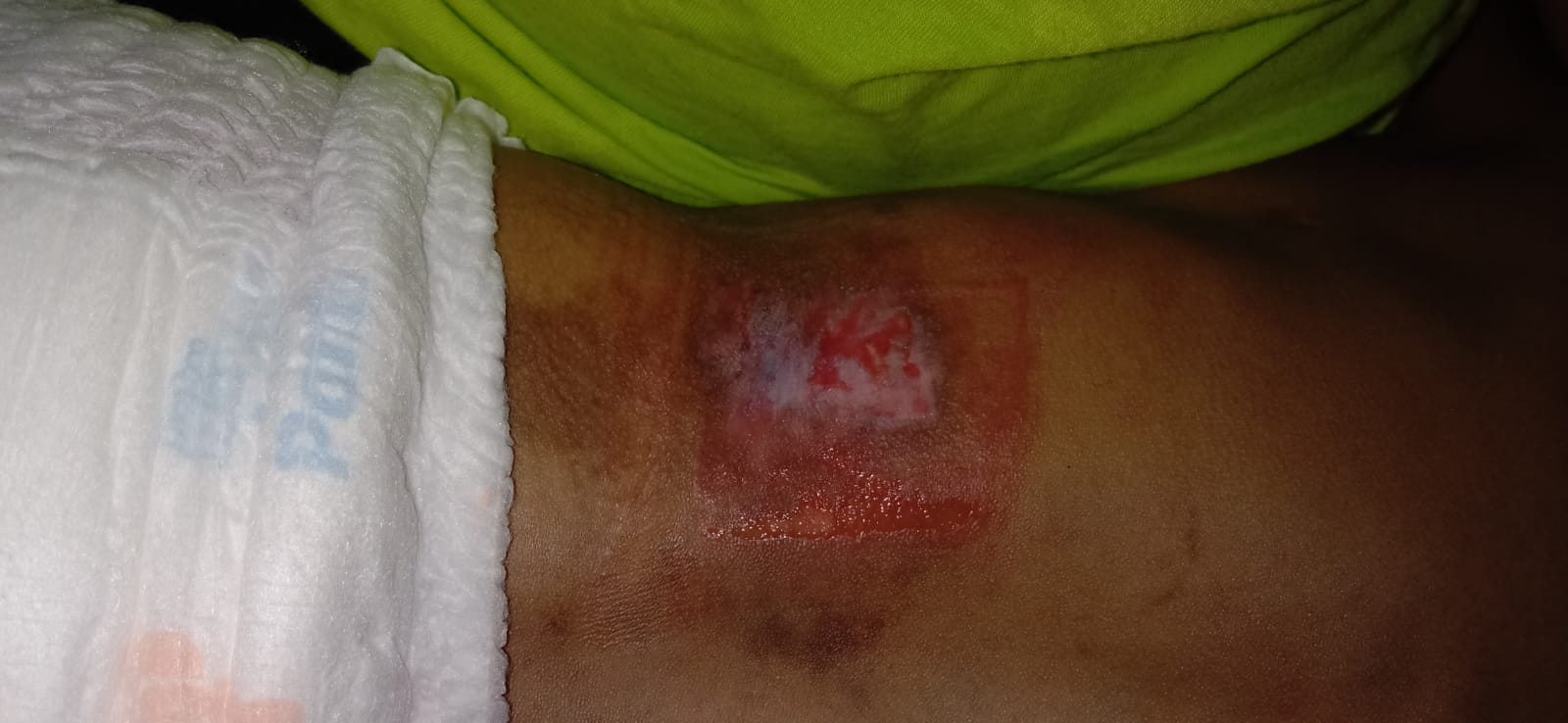 Ada luka di punggung Rasya, tapi alhamdulillah lukanya sudah sedikit kering setelah beberapa minggu lalu Rasya berobat. Sebelum berobat, lukanya selalu mengeluarkan darah dan tercium bau tak sedap.