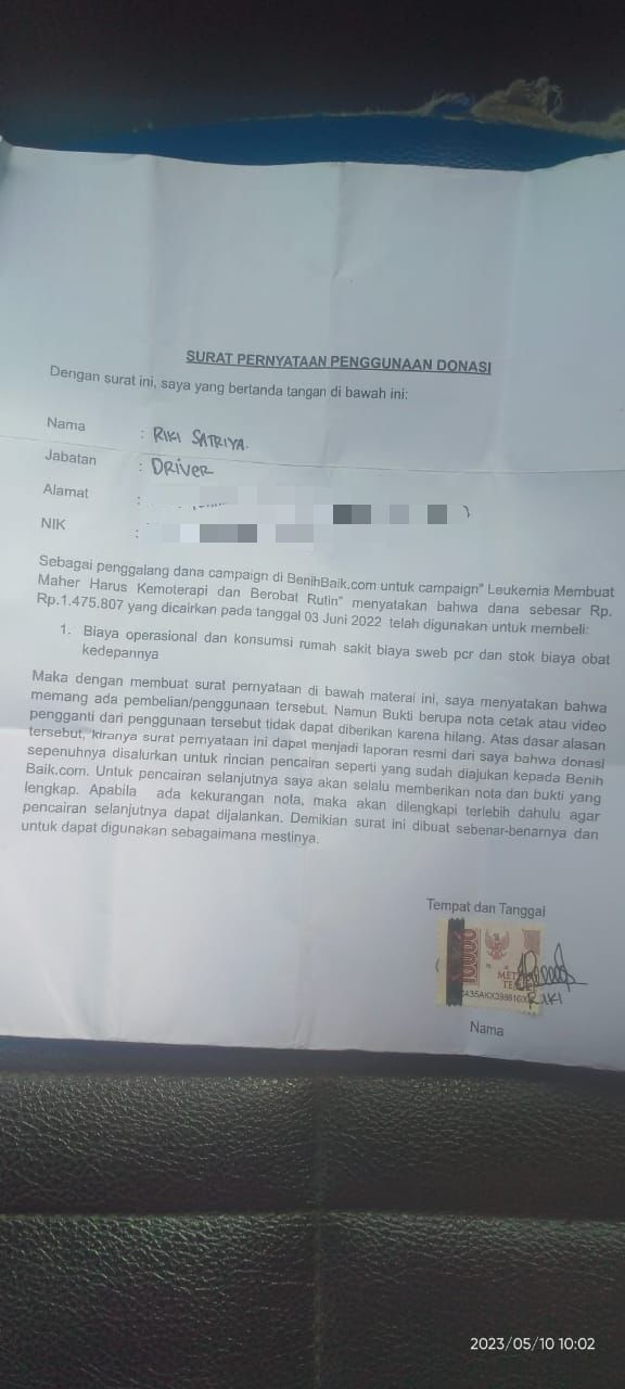 Dana digunakan untuk 1. Obat 6 MP (Merkaptopurin) satu botol isi 25 kapsul Rp500.000 2. Sisanya digunakan untuk pembelian popok BabyHappy 1 ball Rp65.000.