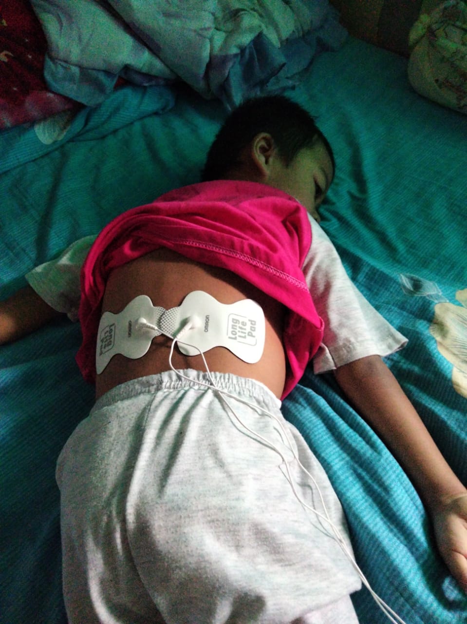 Anakku belum bisa duduk seimbang, apa lagi berdiri. Bahkan  sarapan dan mandinya pun masih dengan aku.  Saat malam, anakku menggunakan alat terapi yang kemarin sudah dibeli. Anakku Menggunakan alat ini selama 3 kali seminggu.  Oya TemanBaik, anakku juga belum bisa jalan dan masih harus fisioterapi.