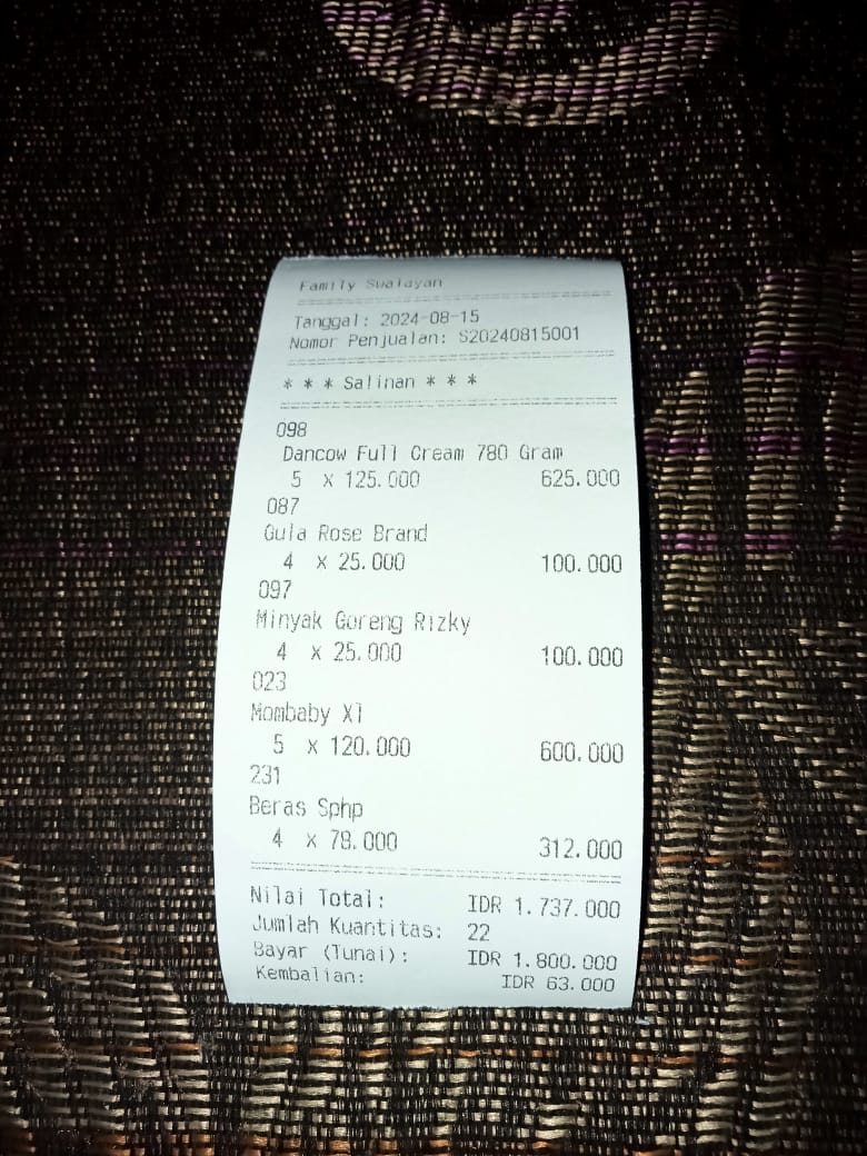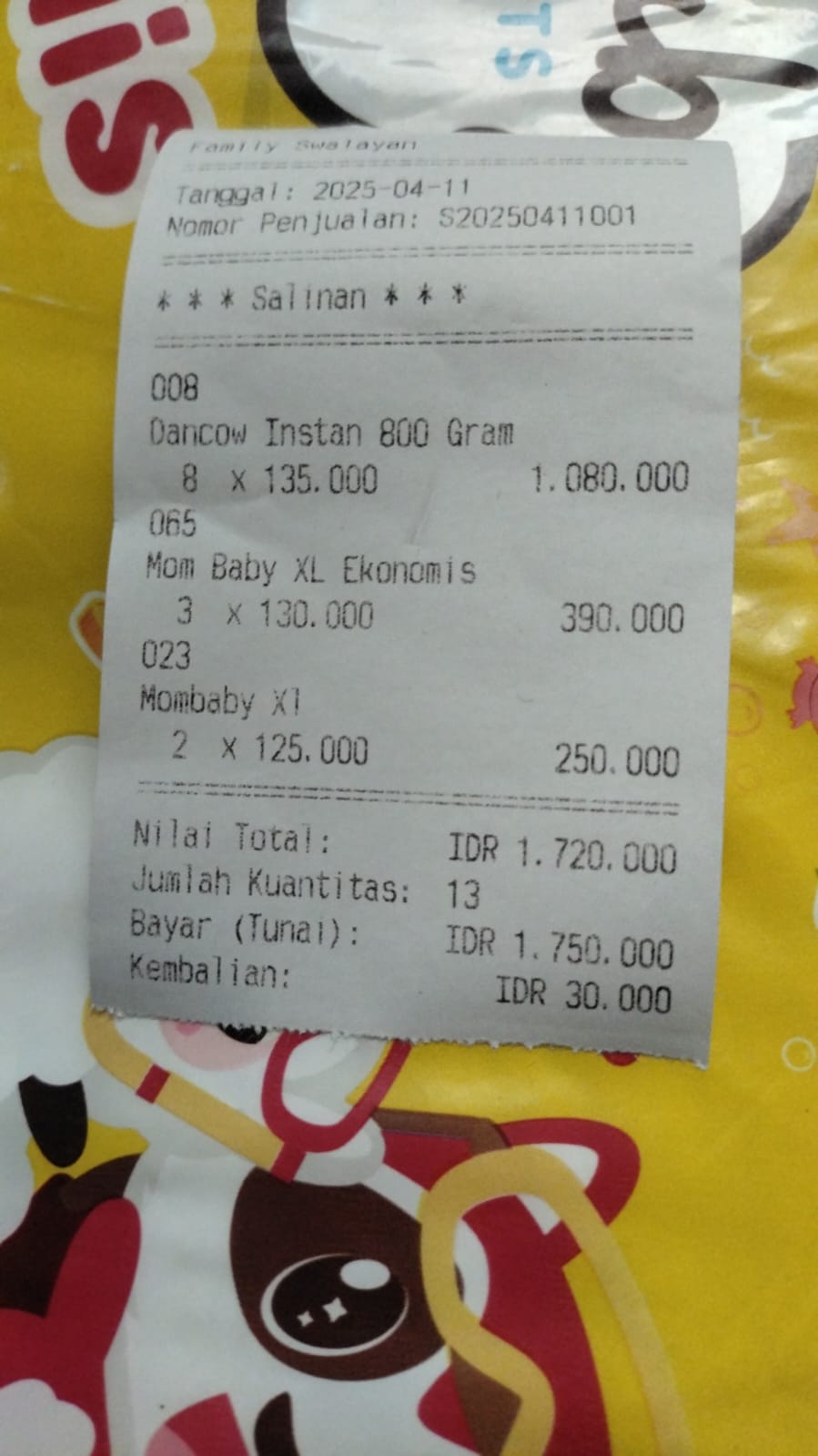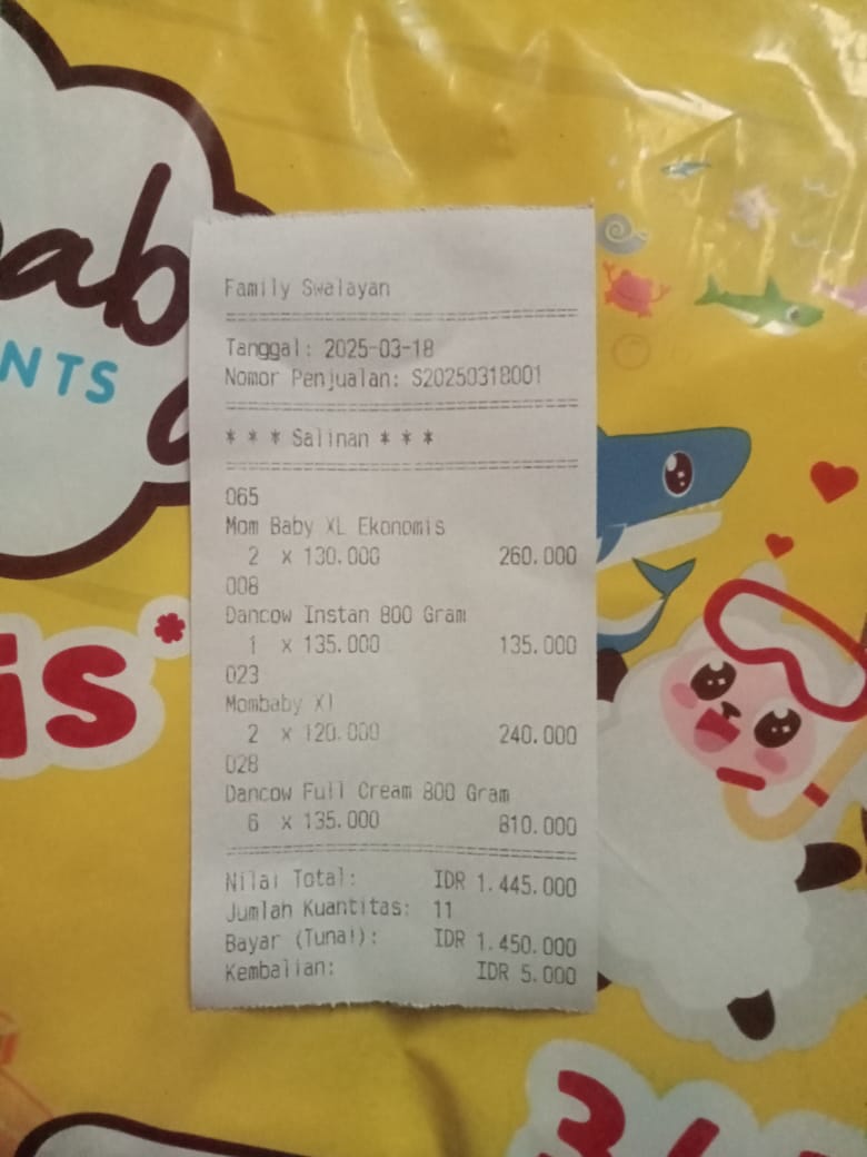 Dana digunakan untuk 1. Susu Dancow Rp 7 kotak x 135.000 =Rp945.000 2. Pampers mom baby / popoku Rp125.000 x 4 ball = 500.0002025-03-19 13:43:17