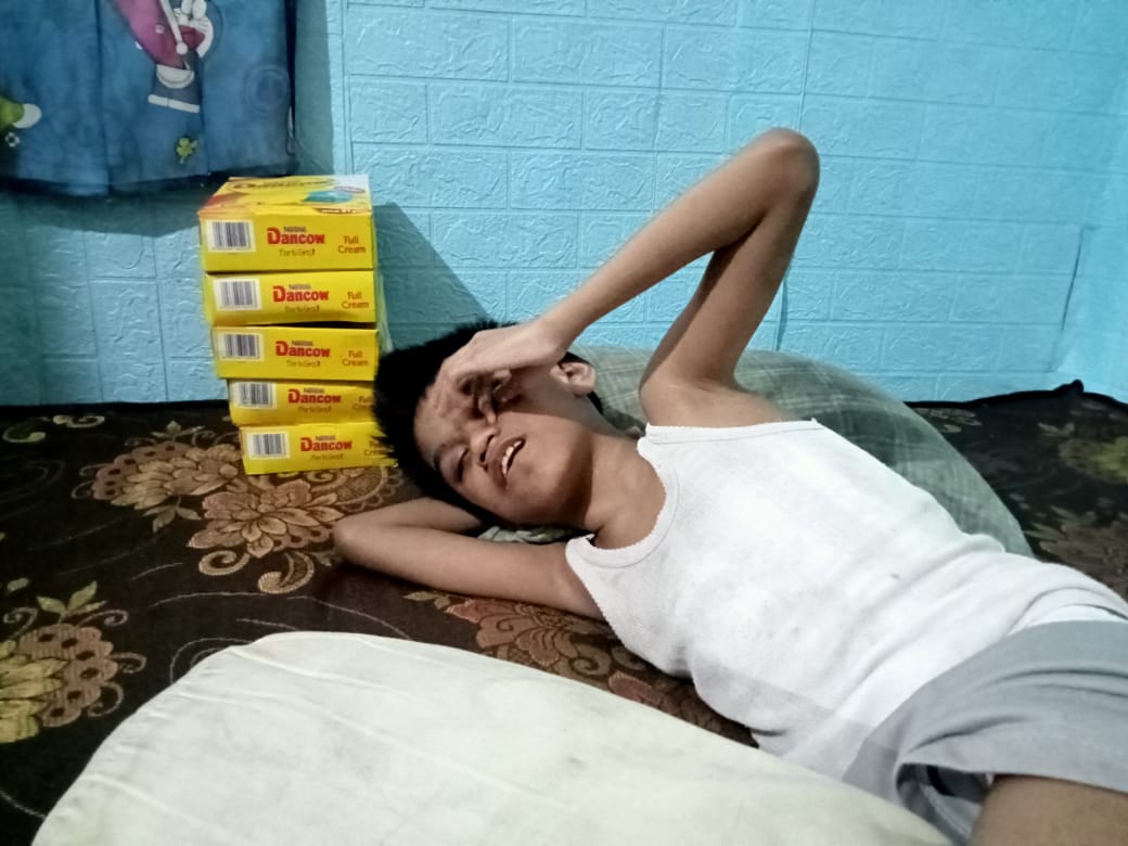 Kondisi kesehatan anak saya saat ini mata kanan sulit dibuka dan berat badan anak saya juga semakin menurun. Anak saya sering sesak, butuh bantuan oksigen dan harus rutin memakai obat tetes seumur hidup karena penyakit yang dideritanya.