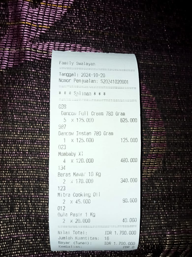 Dana digunakan untuk 1. Susu Dancow Full Cream 98.000 x 7 kotak= Rp686.000 2. Popok 165.000 x 2 pack= Rp330.000 3. Vitabumin 123.000 x 2 botol= Rp246.000.2023-11-16 18:24:09