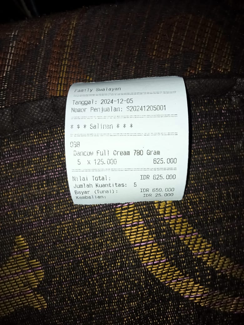 Dana digunakan untuk pembelian Susu Dancow full Cream 98.000 x 10 kotak= Rp980.000.2023-05-08 16:16:42