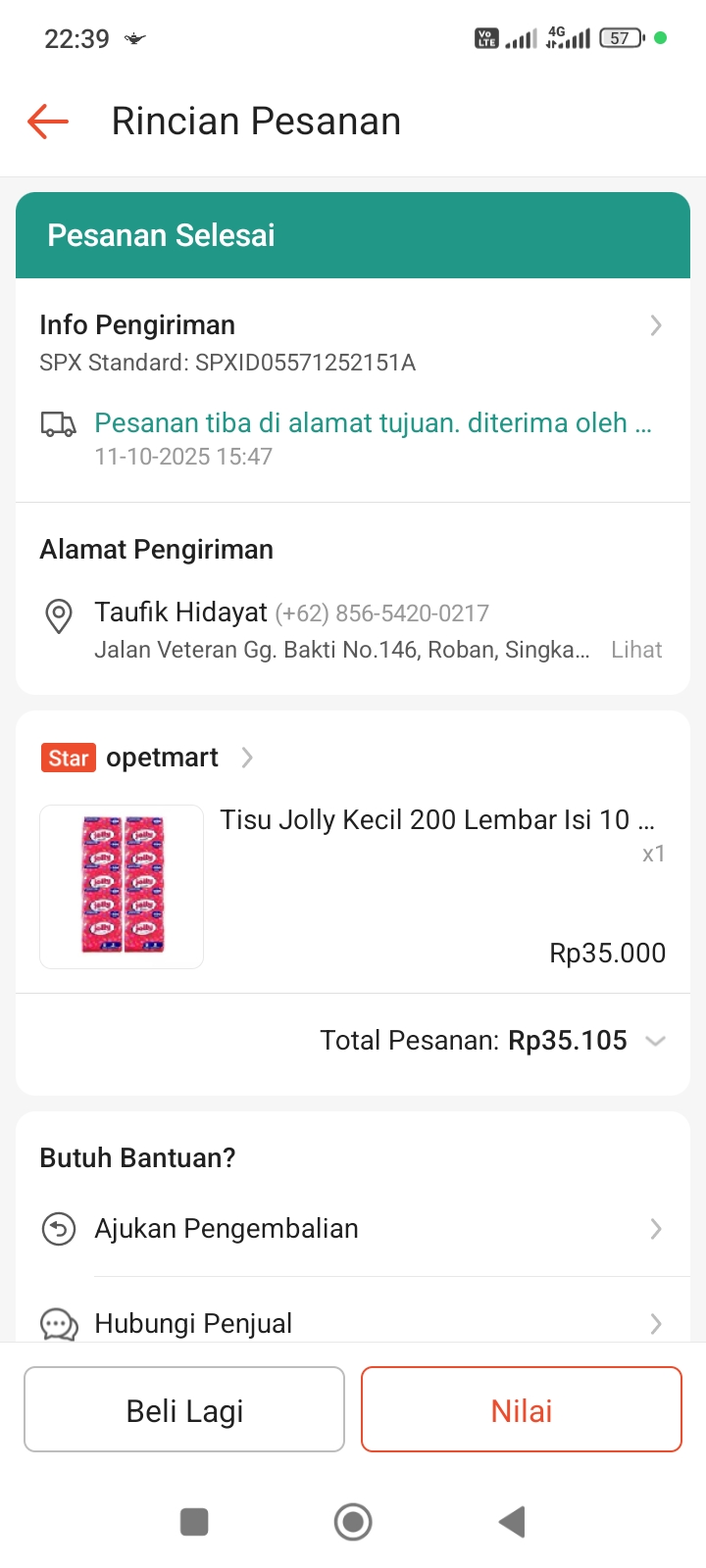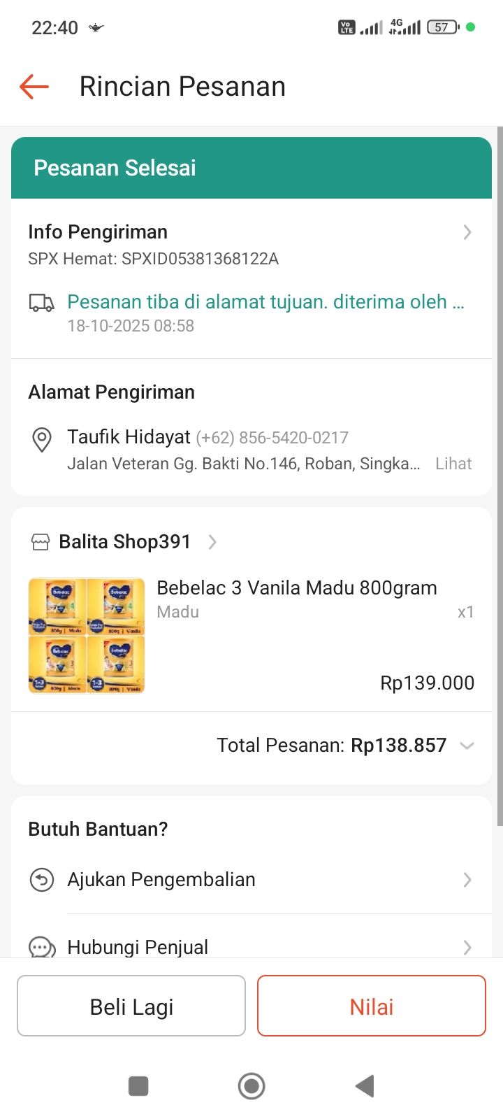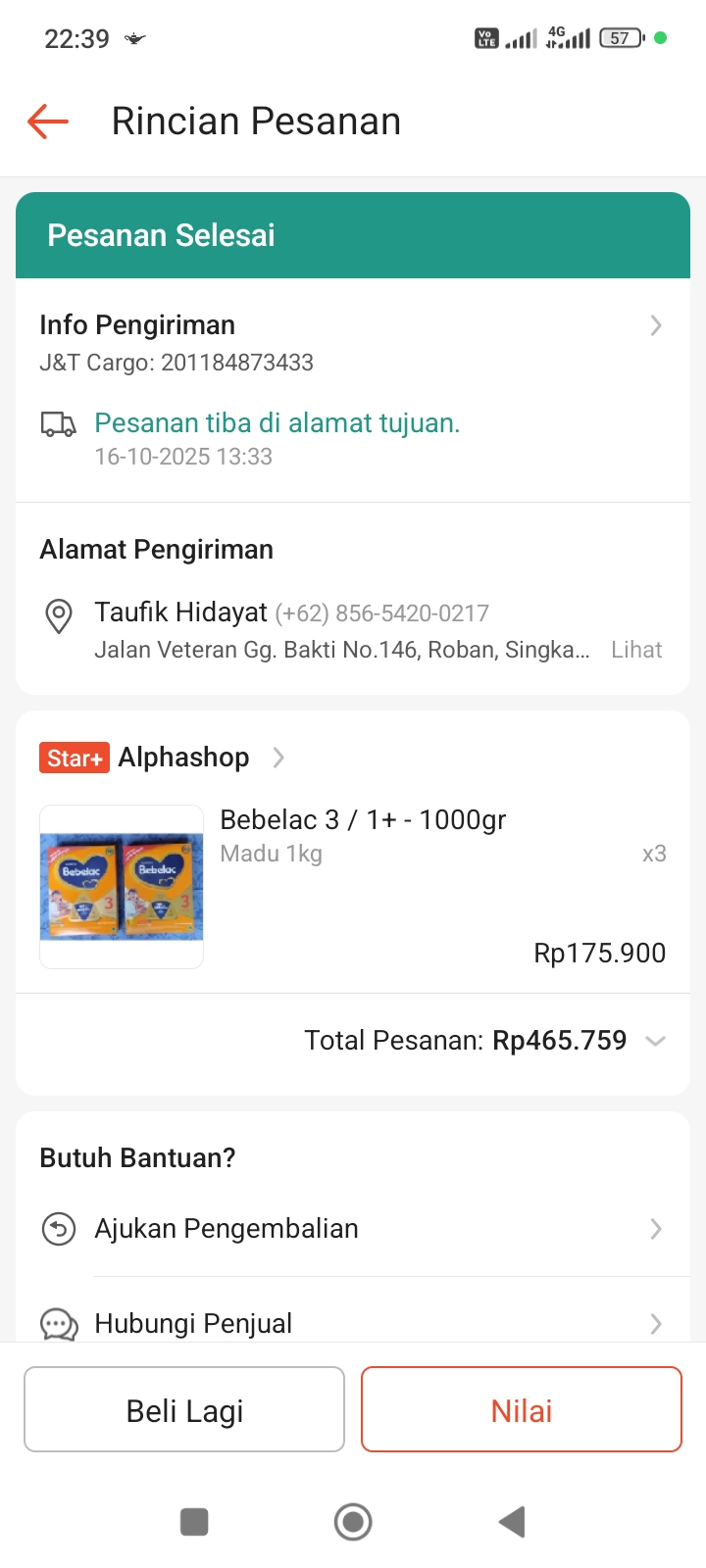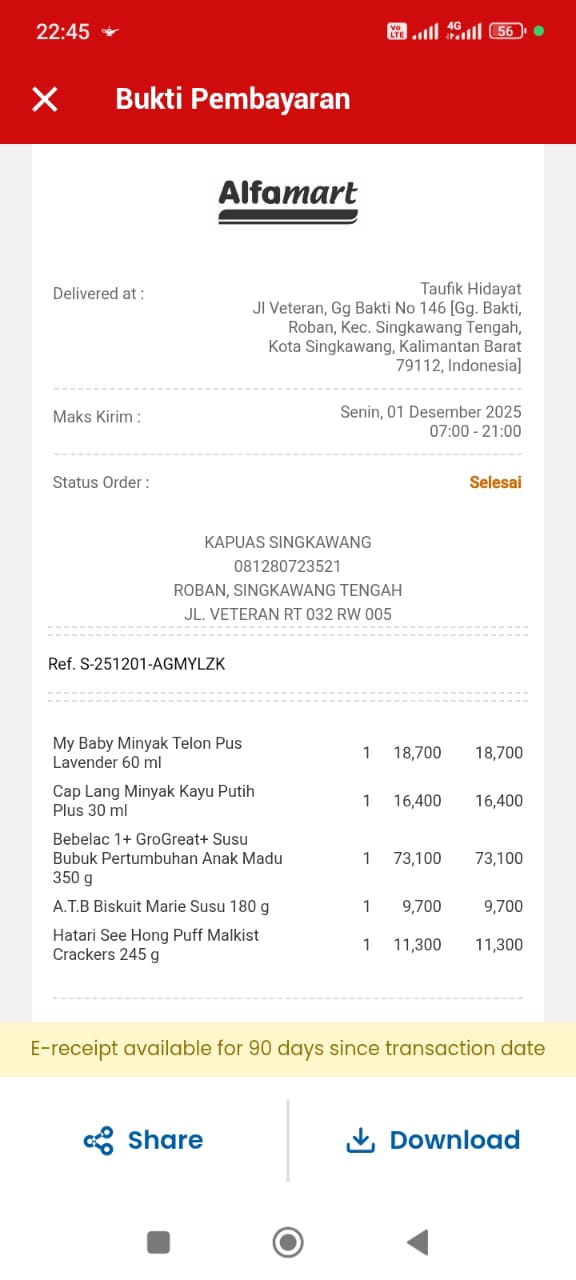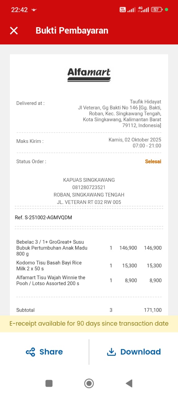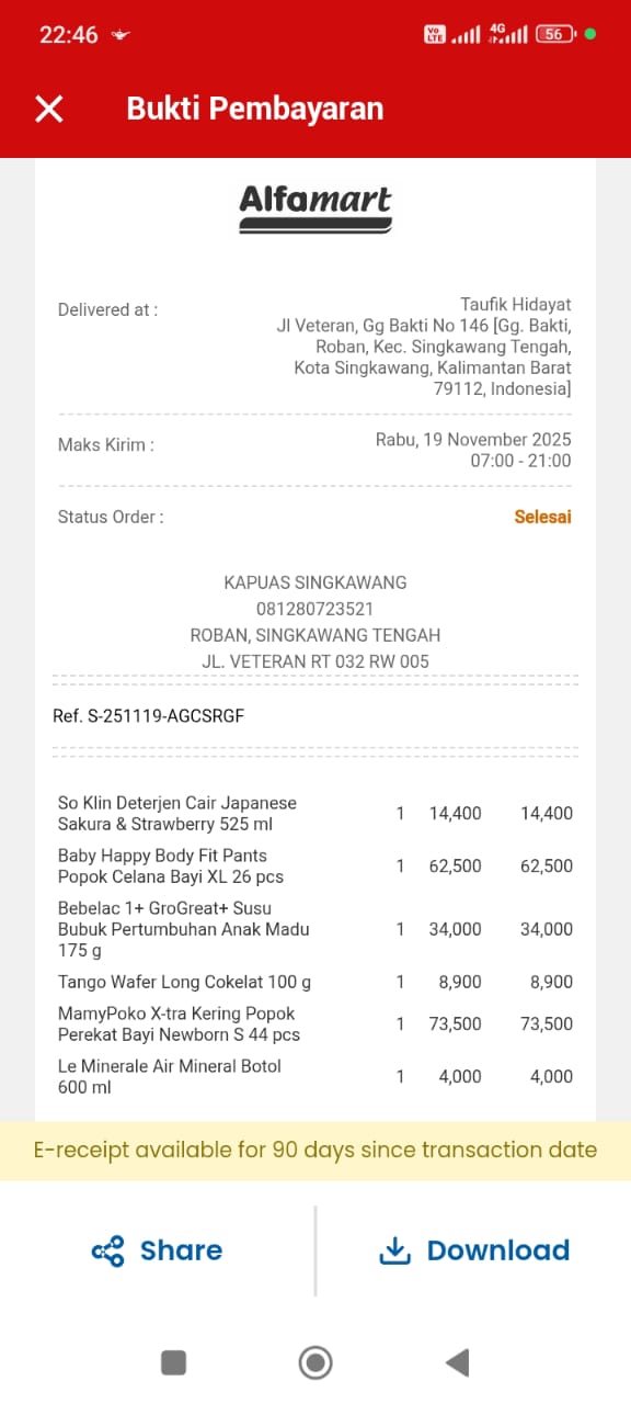 Dana digunakan untuk 1. Pampers Baby happy 5x p48.500:= Rp.242.500 2. Susu Bebelac 1+ madu 3x Rp135.400= Rp406.2002025-12-19 11:15:22