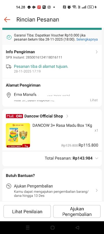 Dana digunakan untuk 1. Biaya kos Jakarta periode 18 Nopember 2025 hingga 17 Desember 2025 Rp1.500.000 2. Popok Mamy Poko Junior XXXL Rp 201.990 x 6 ball= Rp 1.211.940 3. Dancow Madu 5+ 1000gram 6 Dos R 664.4742025-11-18 10:26:59