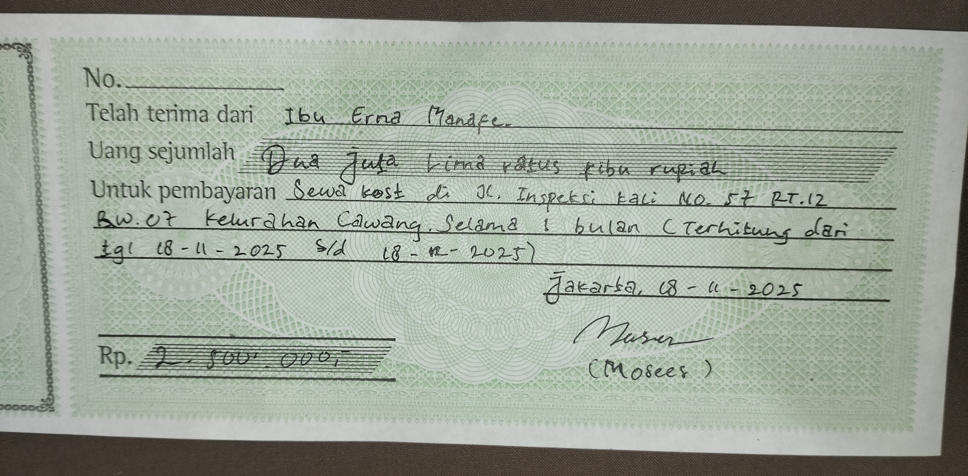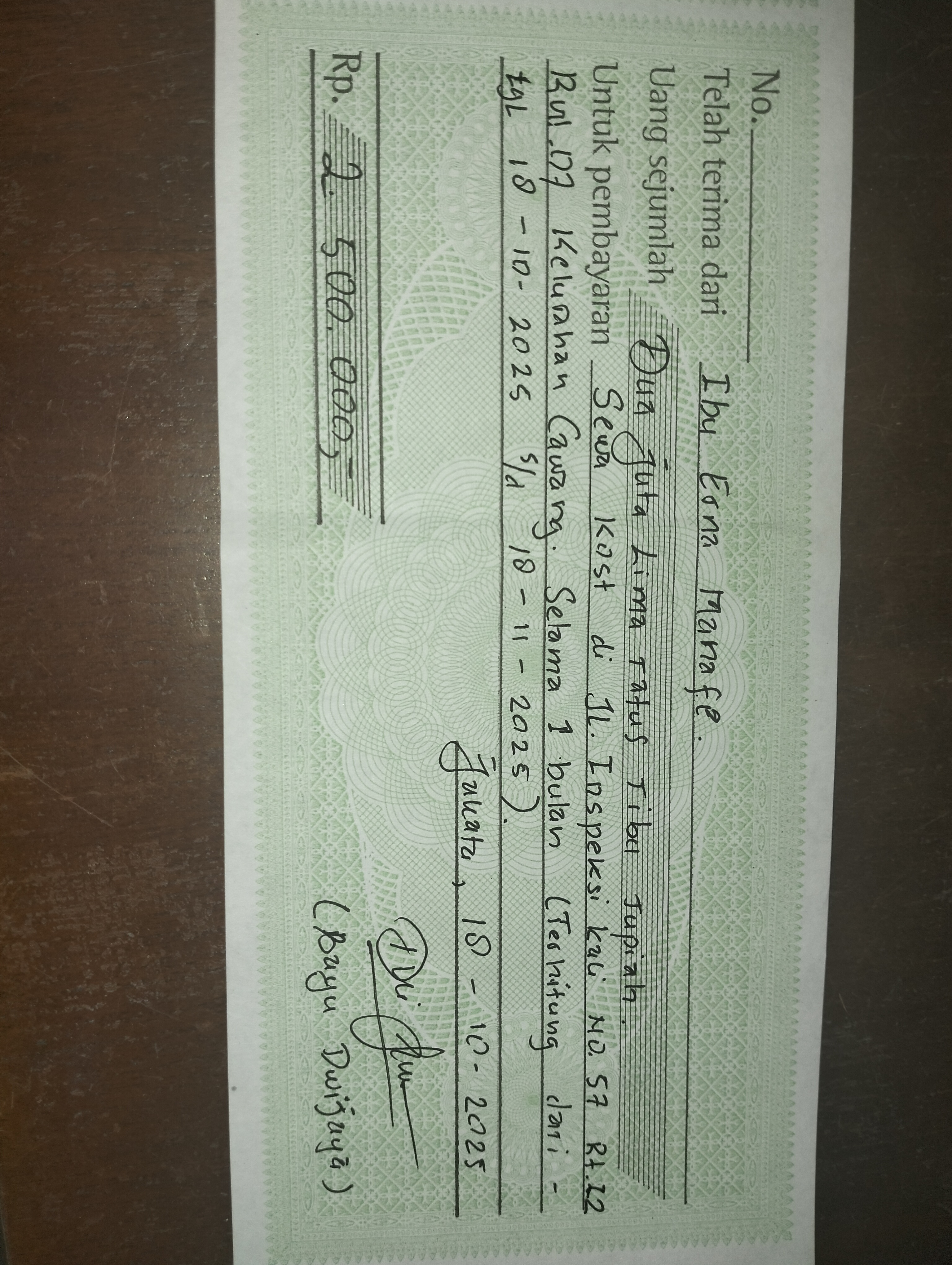 Kwitansi pembayaran kos untuk periode 18 November-18 Desember 2025