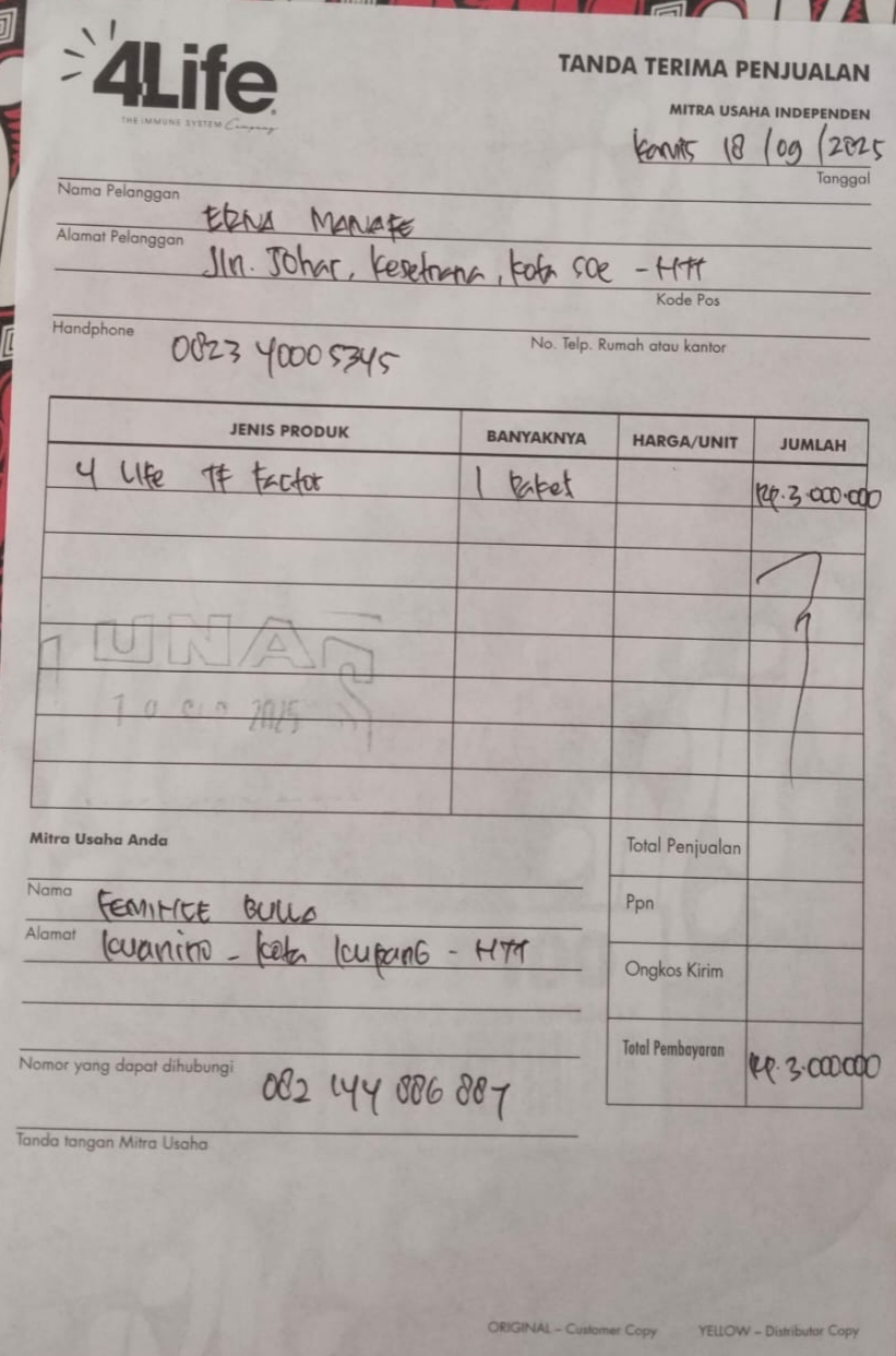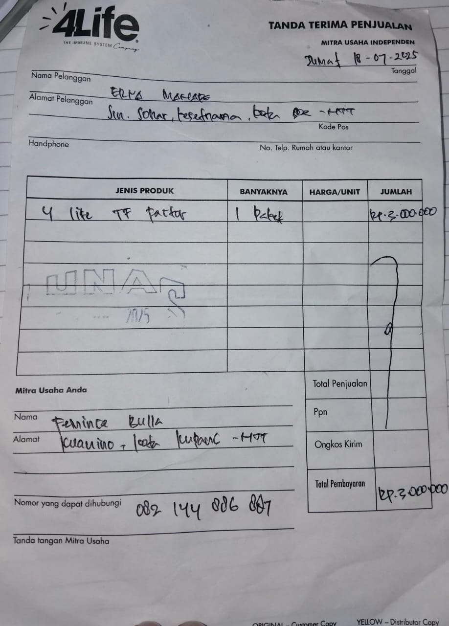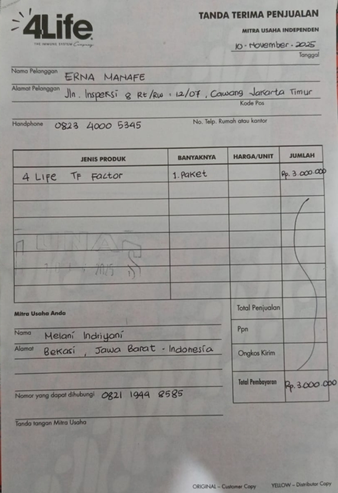 Kami ingin menyampaikan kabar terbaru terkait pencairan donasi untuk Melkior. Dana yang diterima telah digunakan untuk membeli suplemen imunitas tubuh Transfer Factor 4Life, dan berikut kami lampirkan bukti kwitansi pembeliannya.