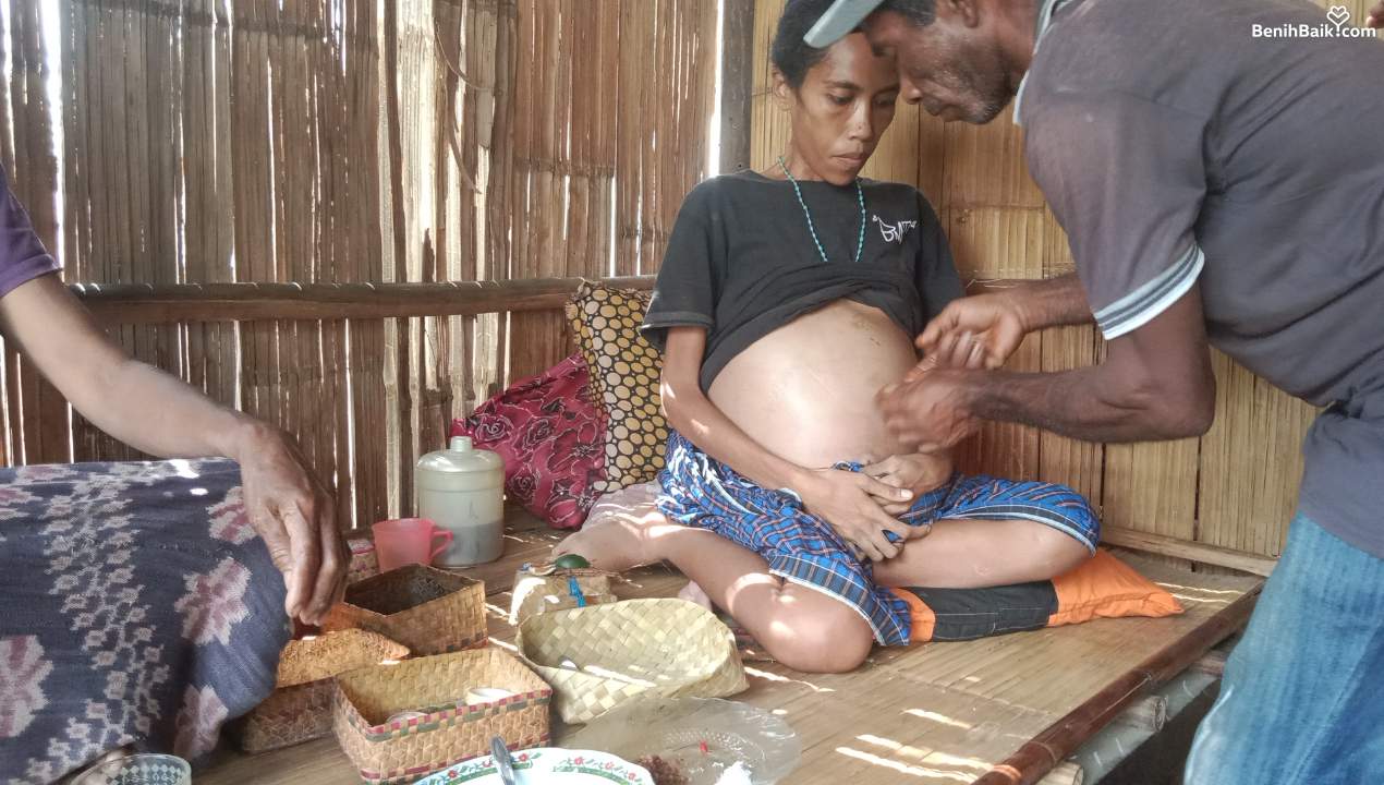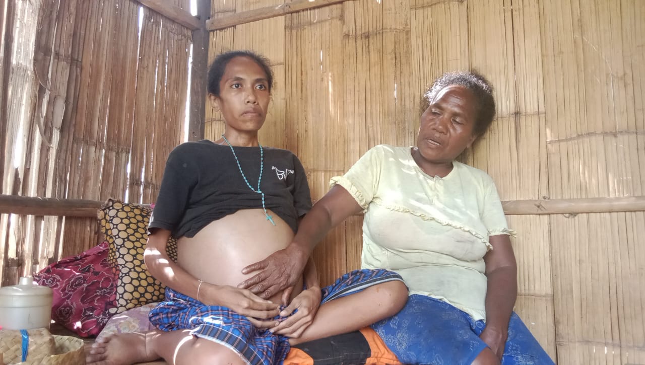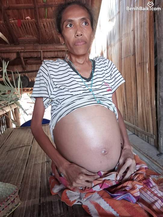 Ini anakku Mina (29th), kami tinggal di Sikka, Nusa Tenggara Timur. Anakku ini bukan sedang hamil, melainkan sedang menderita mioma uteri (tumor rahim), yang membuatnya sangat kurus dan perutnya membesar.