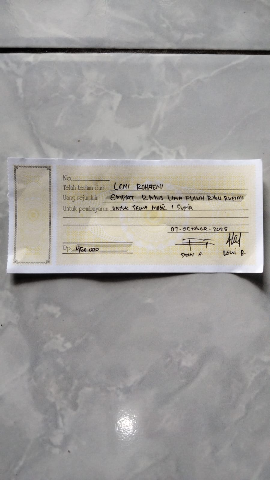 Dana digunakan untuk 1. Tisu kering Rp36 000 × 7 = Rp252 000 2. Tisu basah Rp15 000 × 5 = Rp75 000 3. Transportasi Sewa mobil dari bandung ke jakarta PP Rp450 000 4. EToll dan parkir Rp300 000 5. Konsumsi Kontrol Rp400 000 6. Bensin mobil Rp300 0002025-10-07 10:19:43