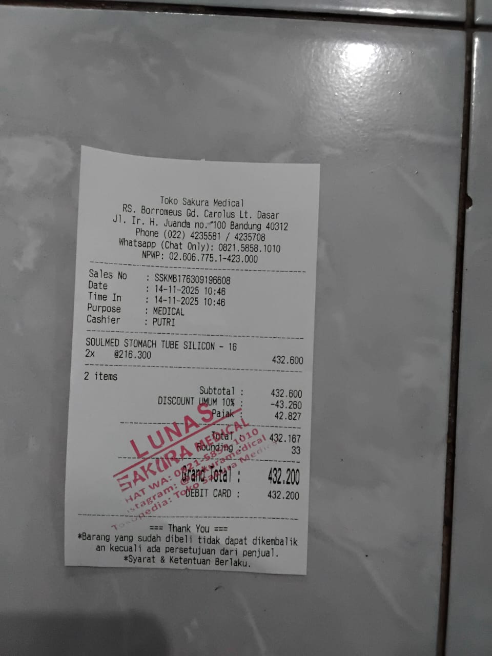 1. Selang NGT silicon Rp240.000 x 2 pcs = Rp480.000
