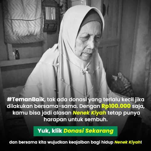 #TemanBaik, tak ada donasi yang terlalu kecil jika dilakukan bersama-sama. Dengan Rp100.000 saja, kita bisa jadi alasan Nenek Kiyah tetap punya harapan untuk sembuh. Yuk, klik Donasi Sekarang dan bersama kita wujudkan keajaiban bagi hidup Nenek Kiyah!