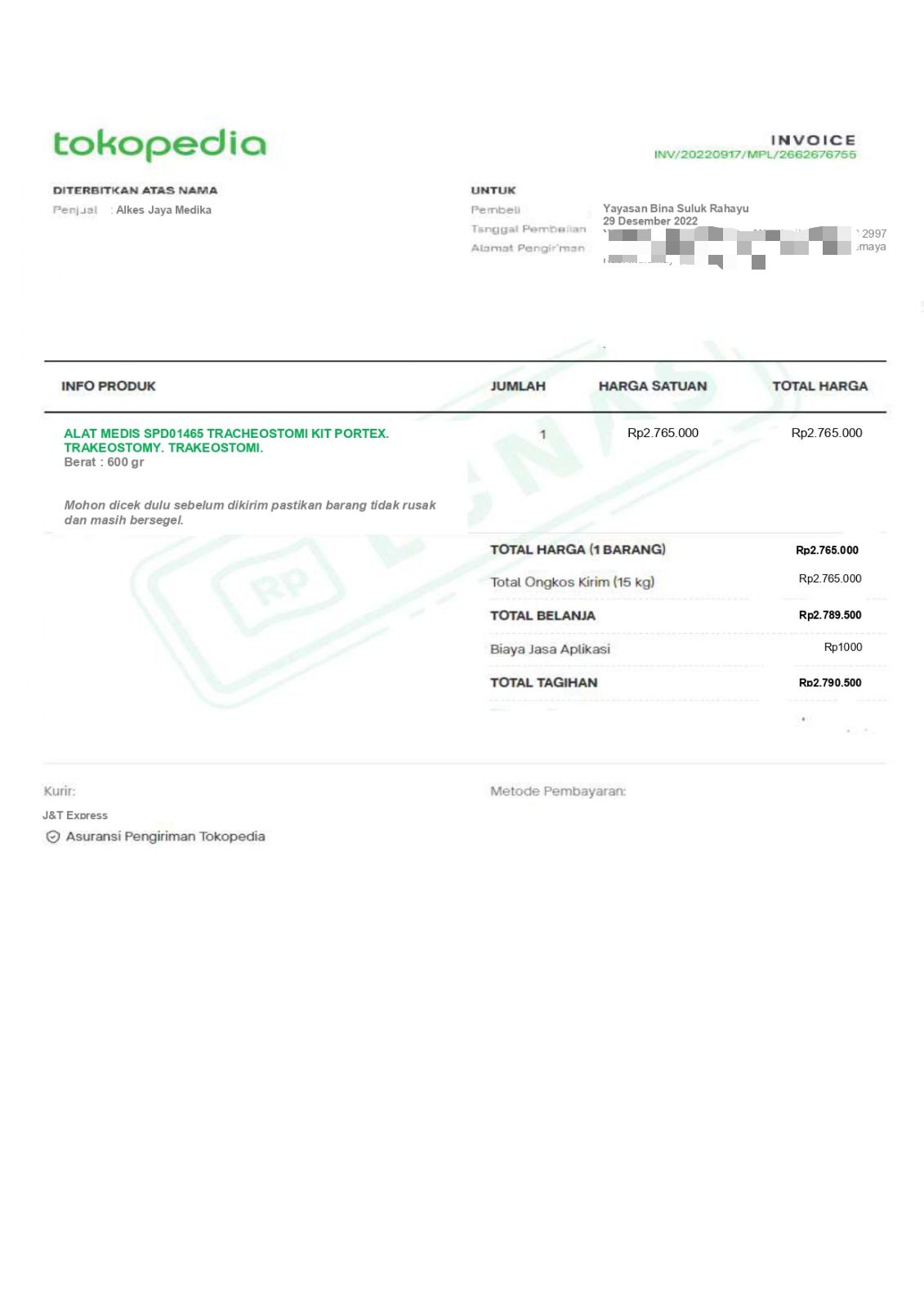 Dana digunakan untuk tambahan kebutuhan pembelian alat trakeostomi sebesar Rp2.790.500.