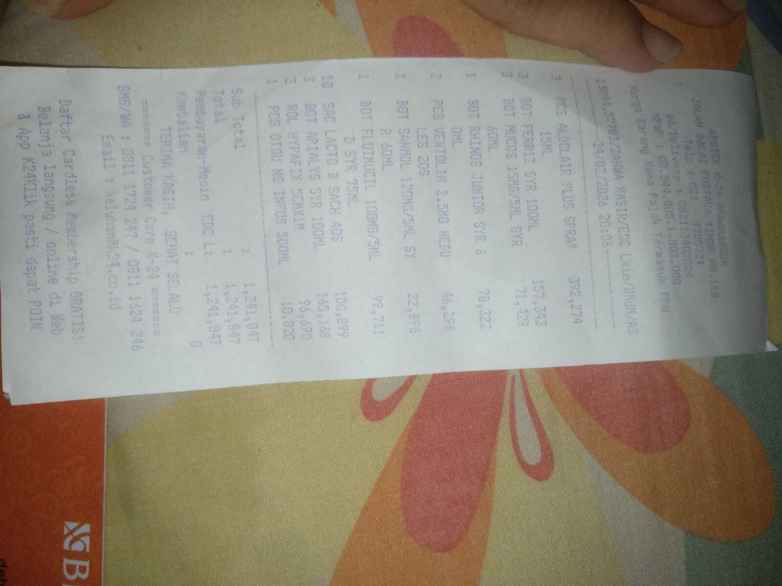 Dana digunakan untuk 1. Pampers 6x Rp85.000 = Rp510.000 2. Susu 800gr 6x Rp172.000= Rp1.030.000 3. Alat nebu Rp500.000 4.Ngt avanos 3x Rp350,000 = Rp1.050.000 5. Buret Rp300.000 6. Stoler Rp1.100.000 7. HYPAFIX 3x Rp35.000= Rp105.000 8.Urin conector Rp150.000 9. Sanmol Syrup Rp30.000 10. Rinos Syrup Rp,80.000 11. Flumucil Syrup Rp100.000 12. Mucos 3x Rp35.000= Rp105.000 14. Apliyalis 3x Rp40.000=Rp120.000 15. Feris 3x Rp60.000= Rp180.000 16. Ventolin 2x Rp50.000= Rp100.000 17. Ncl --2026-02-24 15:56:00