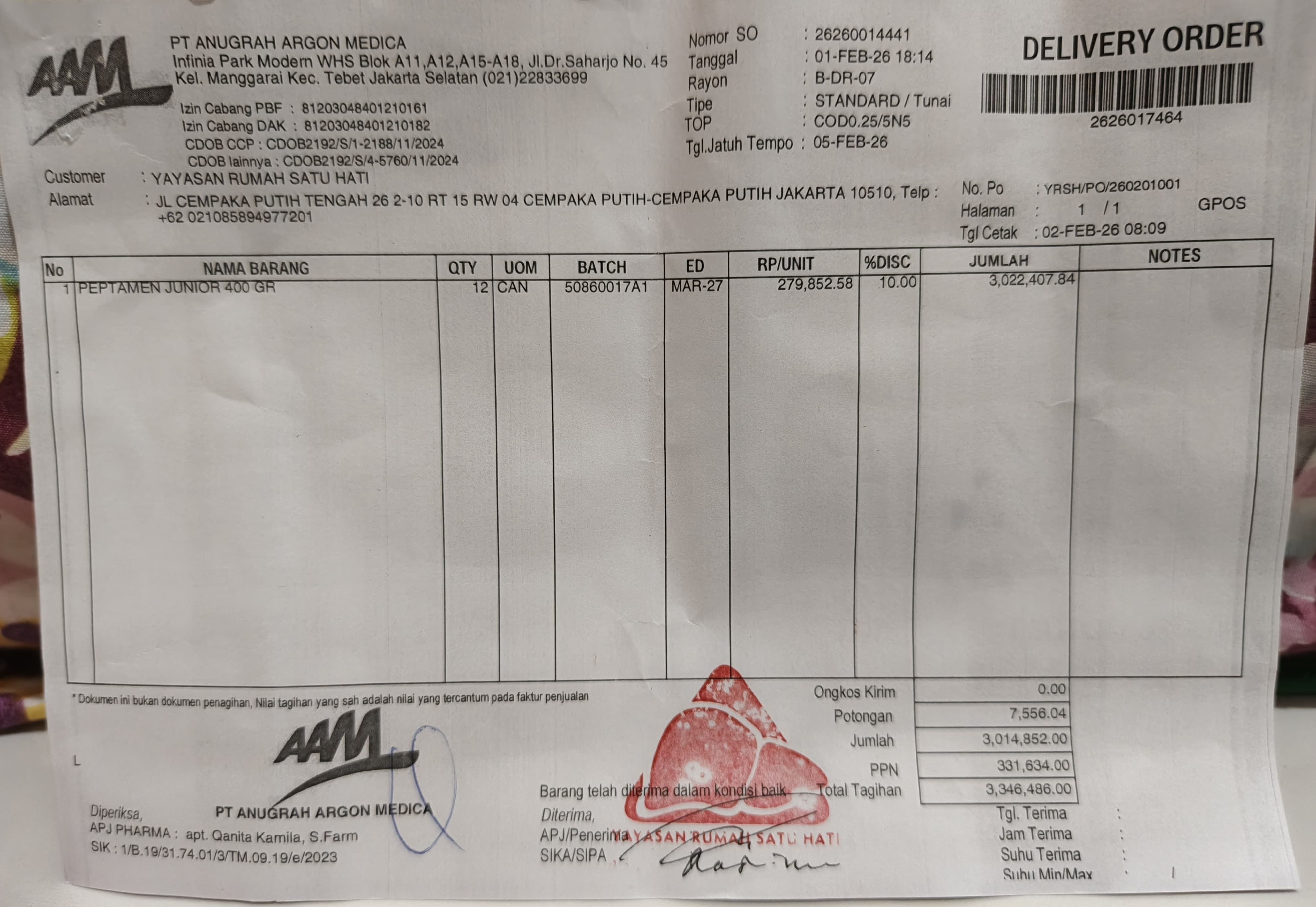 Dana digunakan untuk Susu peptamen junior Rp280.000 x 15 kaleng = Rp4.200.0002025-12-24 10:41:49