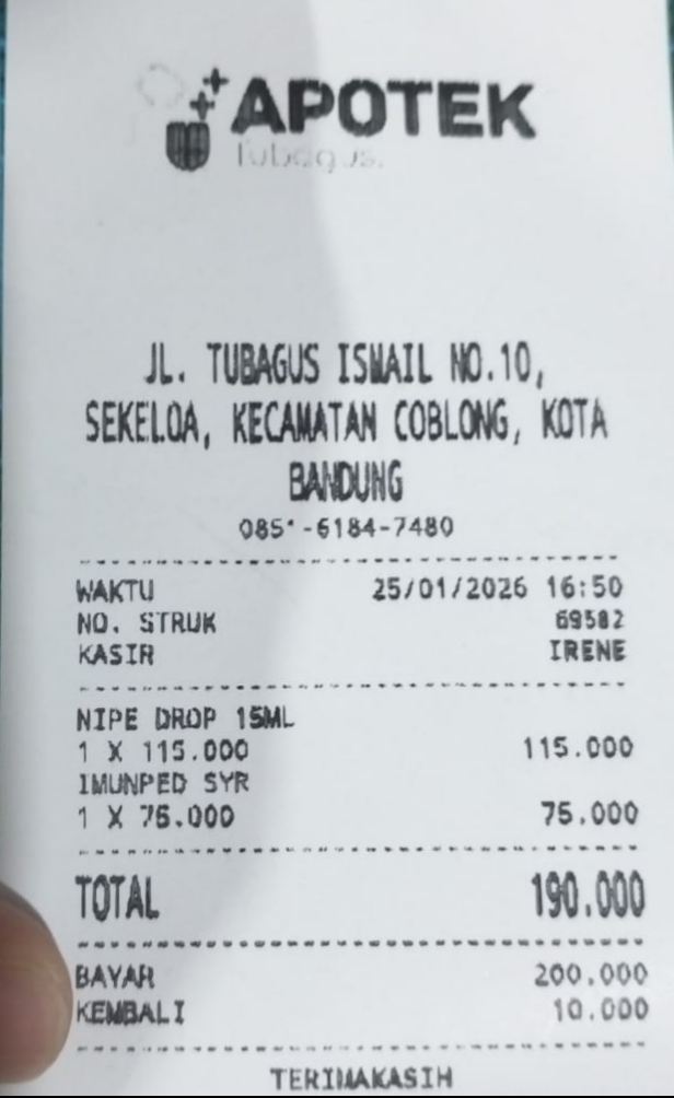 Dana bantuan dari #TemanBaik digunakan untuk pembelian susu, pampers, serta obat Nipe Paracetamol dan Imuped.
