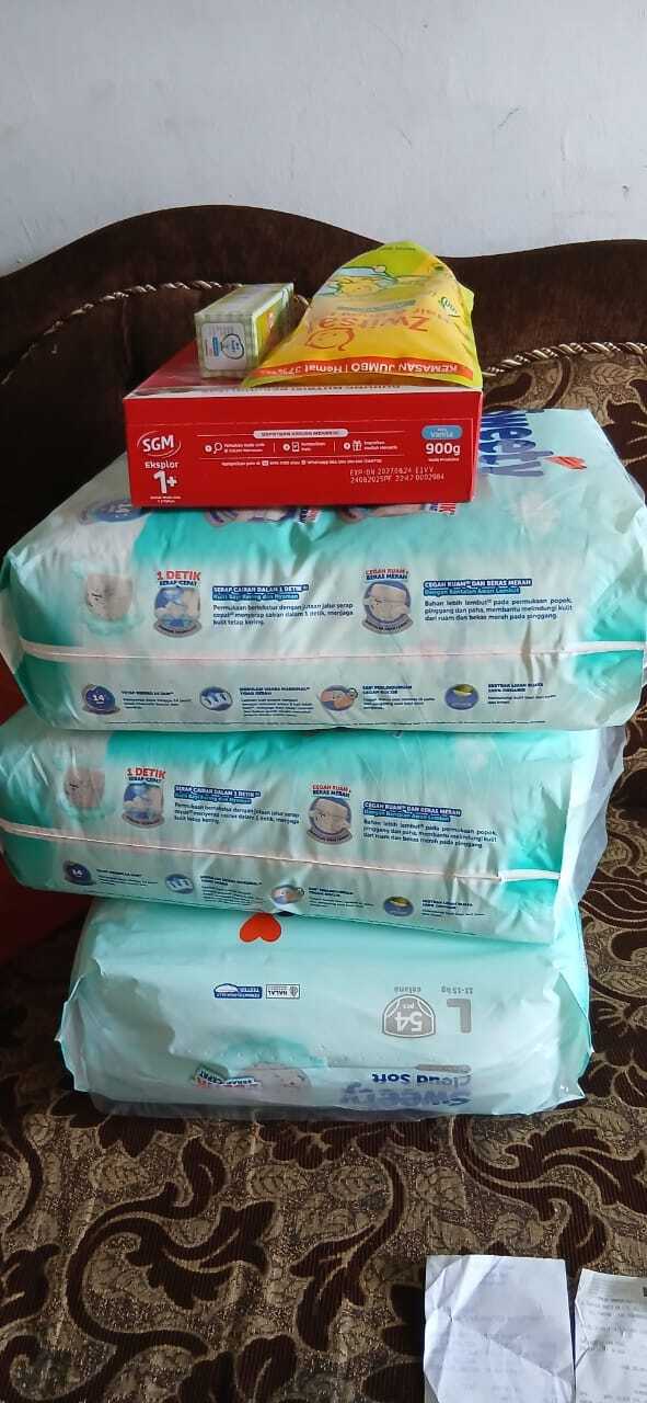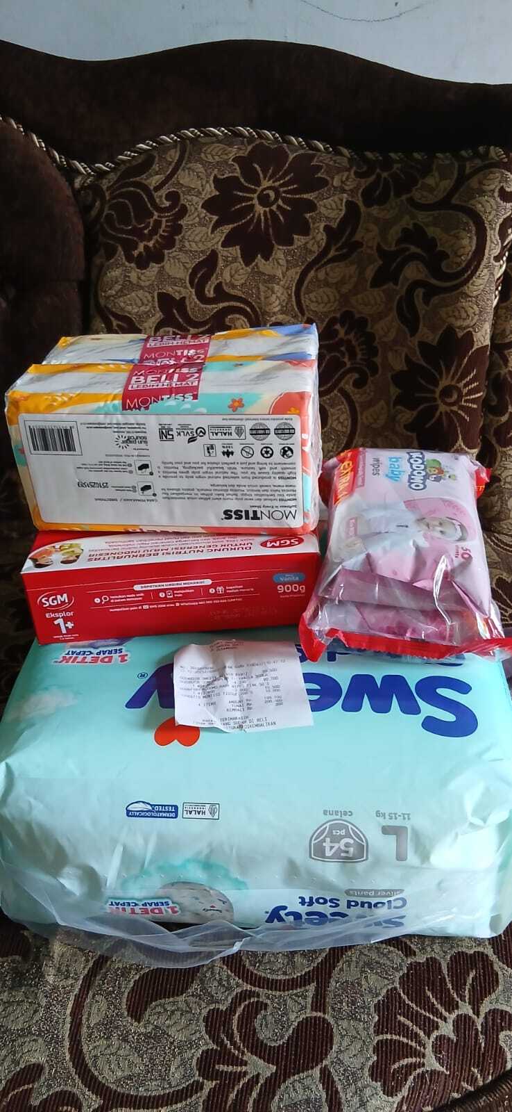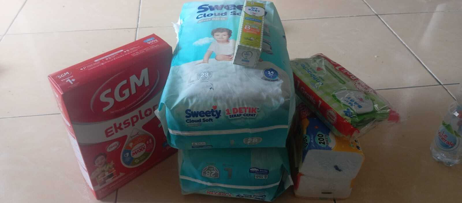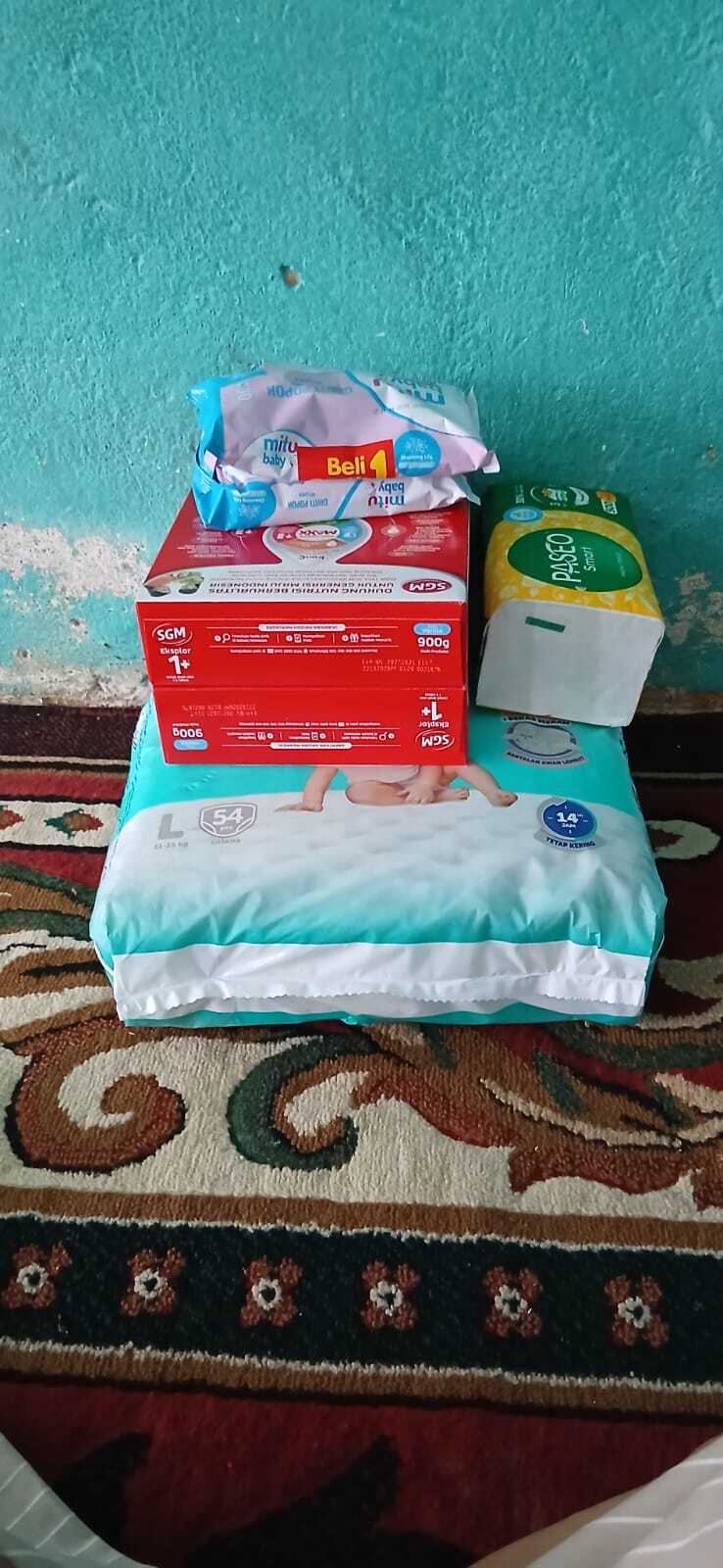 Dana bantuan dari #TemanBaik digunakan untuk pembelian susu, pampers, tisu kering, dan tisu basah.