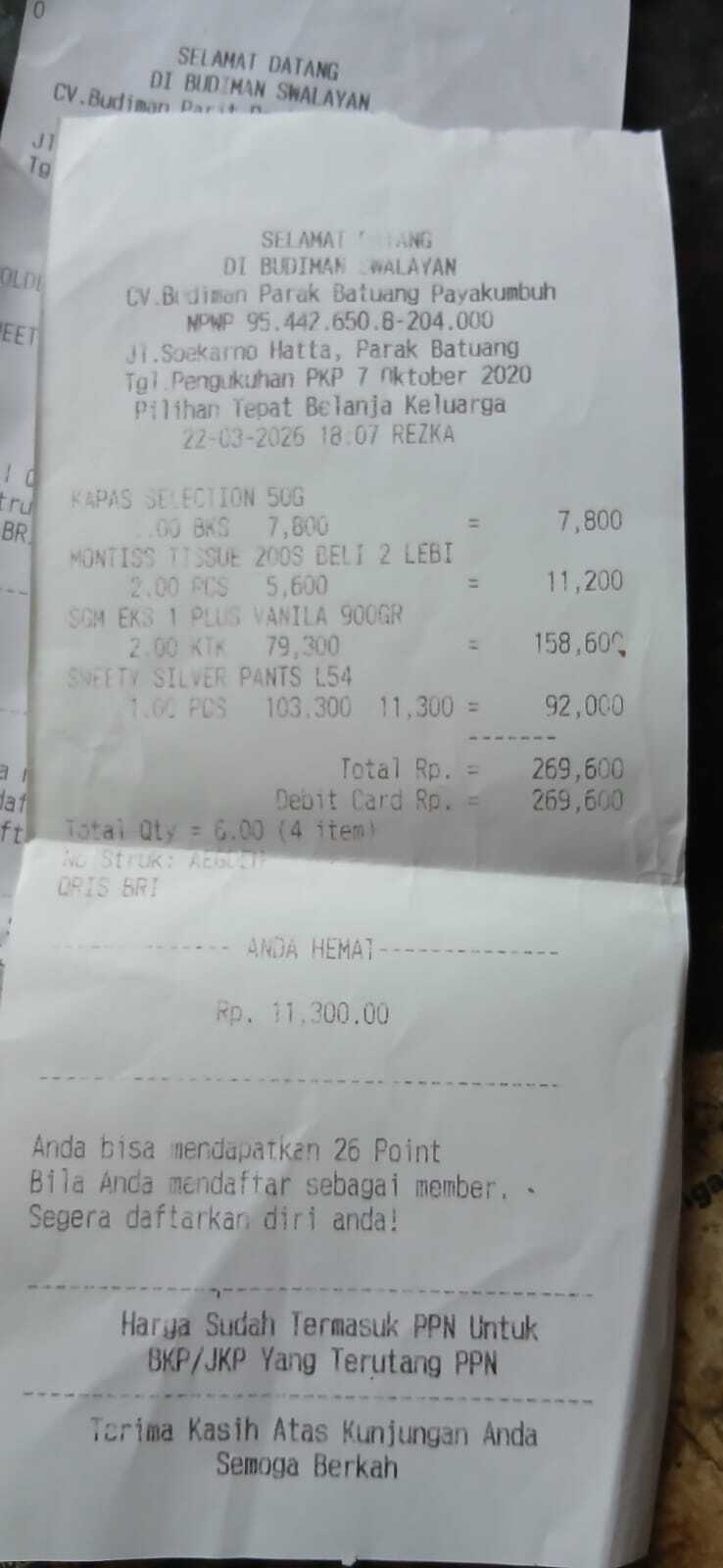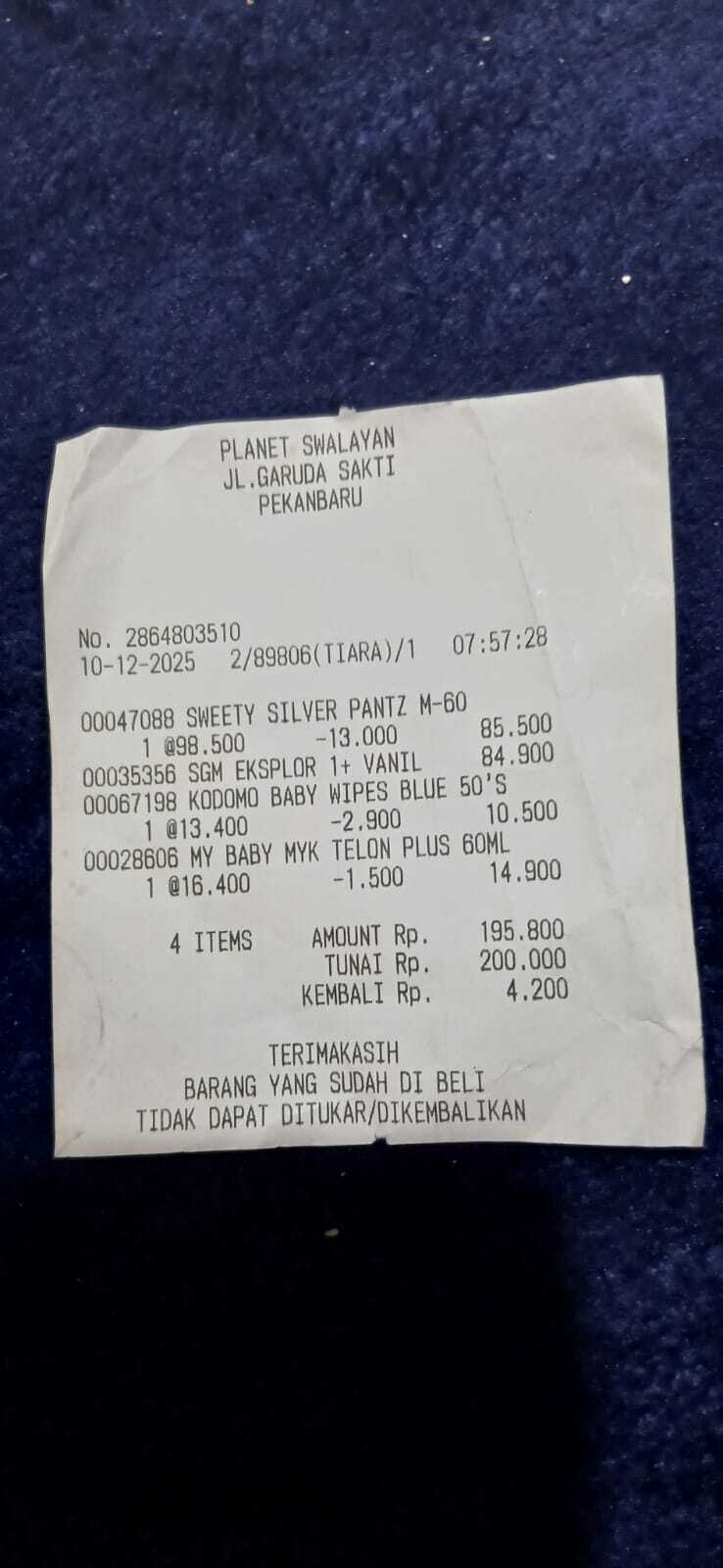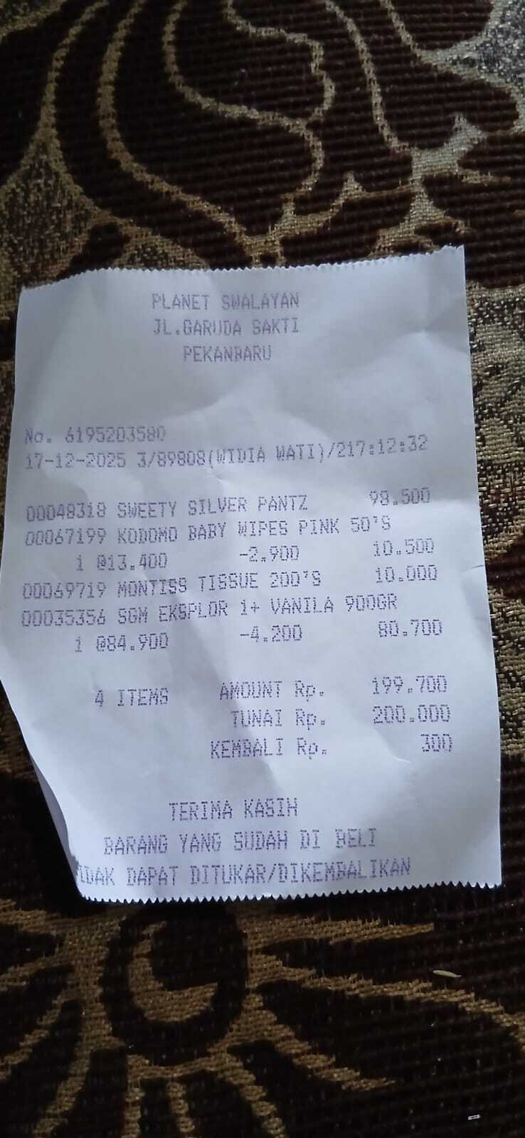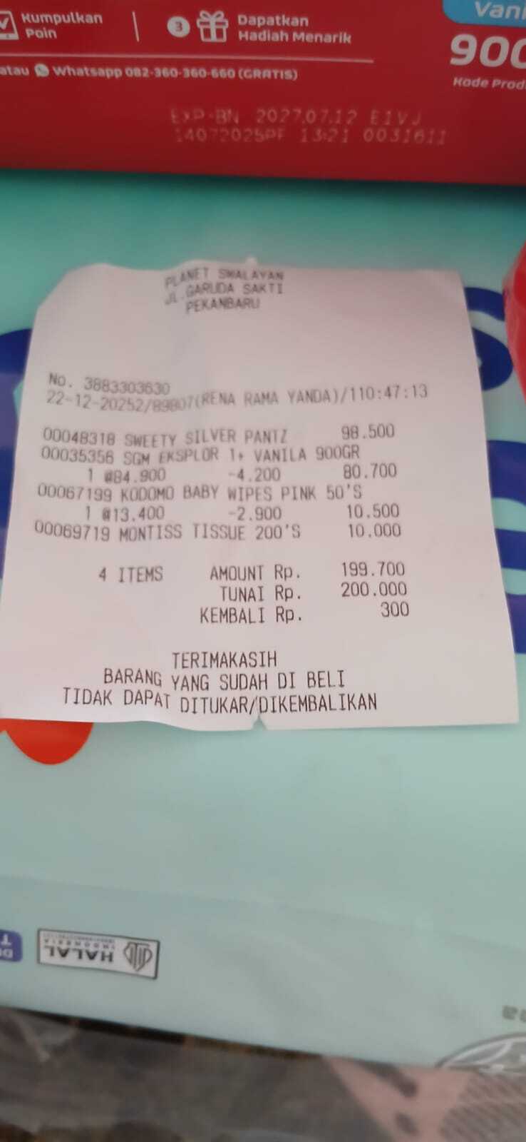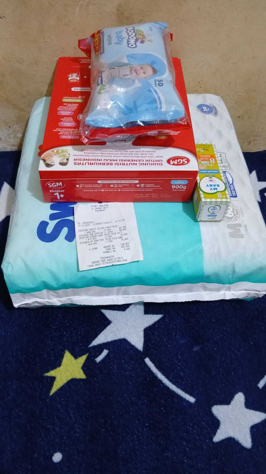 Dana digunakan untuk 1. Susu sgm 4 kotak Rp400.000 2. Pampers swety ukuran M 2 pack Rp200.000 3. Reimburse Susu sgm, pampers, minyak telon dan tisu basah Rp195.0002025-12-11 10:27:50