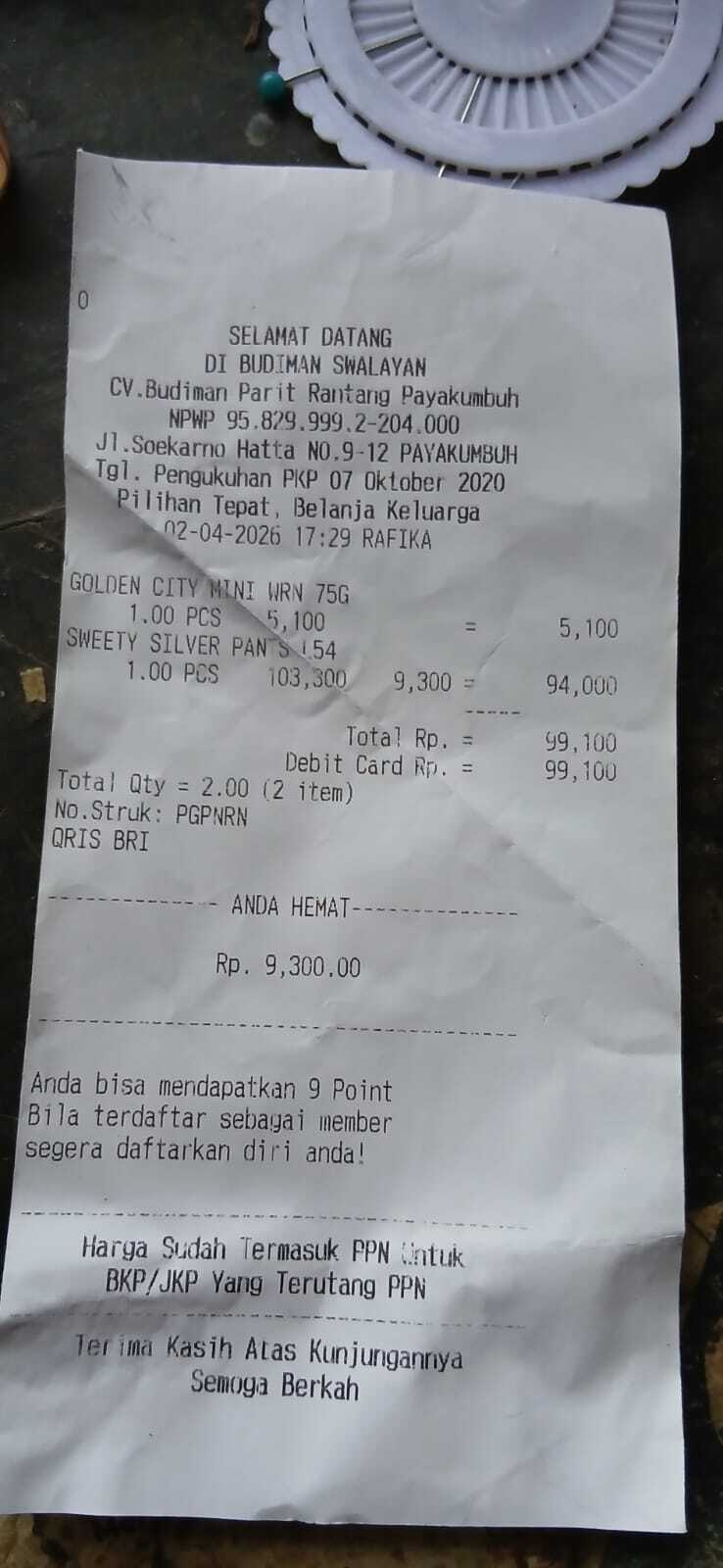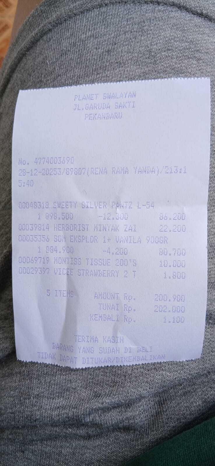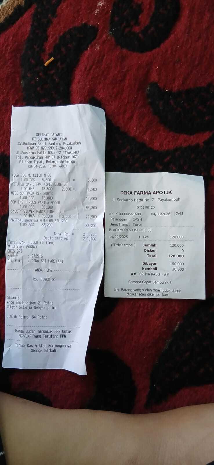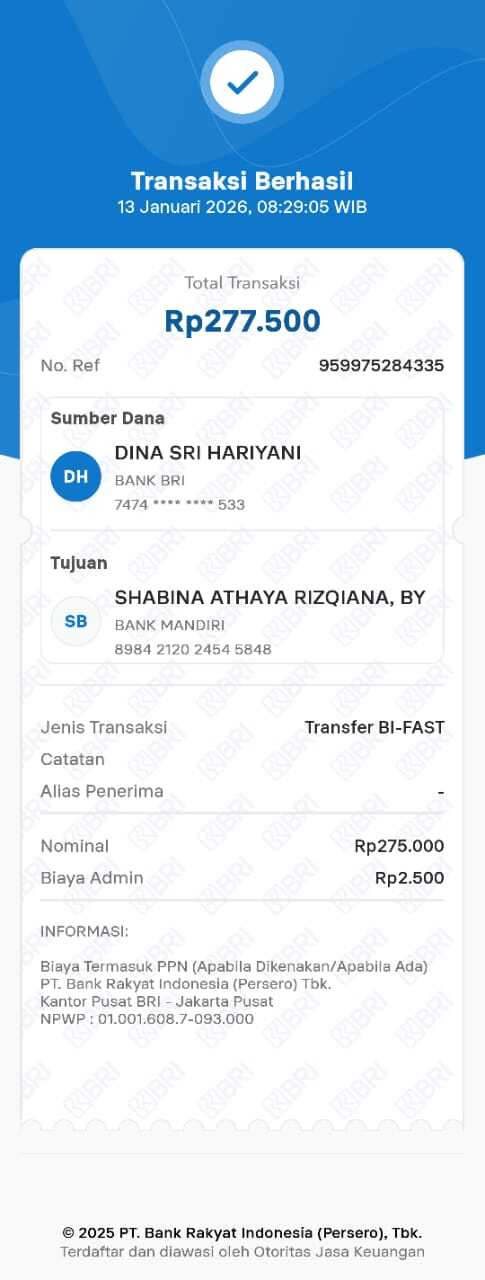 Dana digunakan untuk 1. Susu sgm 900 gram Rp100.000 x5dus = Rp500.000 2. Pampers sweat Rp110.000 x 3 ball = Rp330.000 4. Bigroot nose hygiene stuff Rp110.000 5. Kontrol online ke RS Harapan Kita Rp275.0002025-07-24 09:16:11