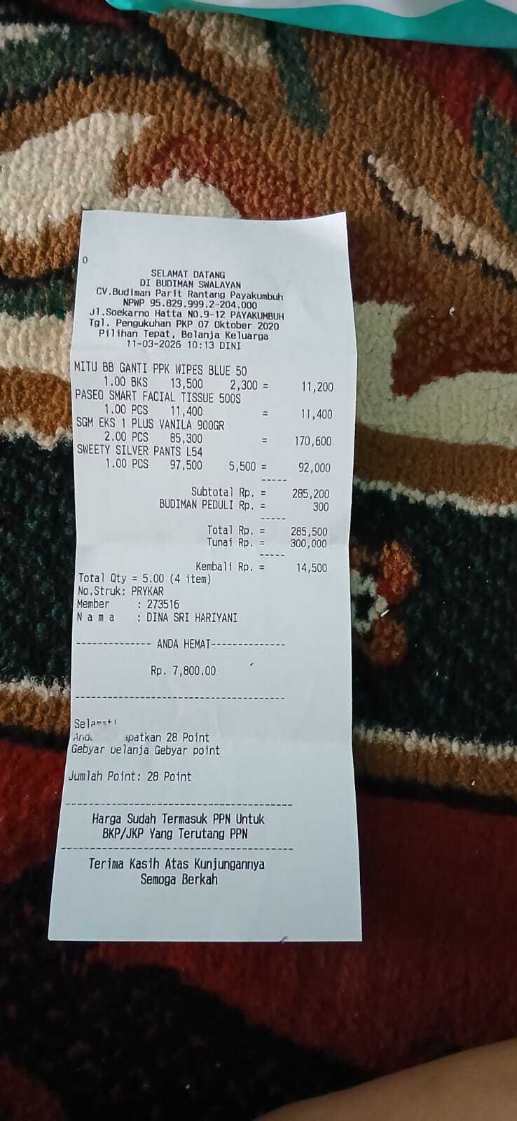 Dana digunakan untuk 1. Susu sgm 5 kotak 1 kotak Rp100.000 x 5 = Rp500.000 2. Pampers swety ukuran L Rp100.000 x 4 = Rp400.000 3. Vitamin minyak ikan Rp100.0002026-03-06 09:49:41