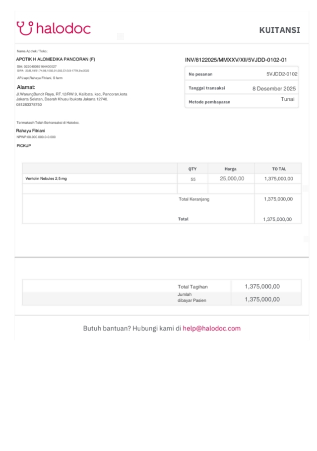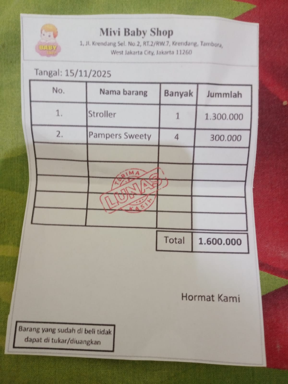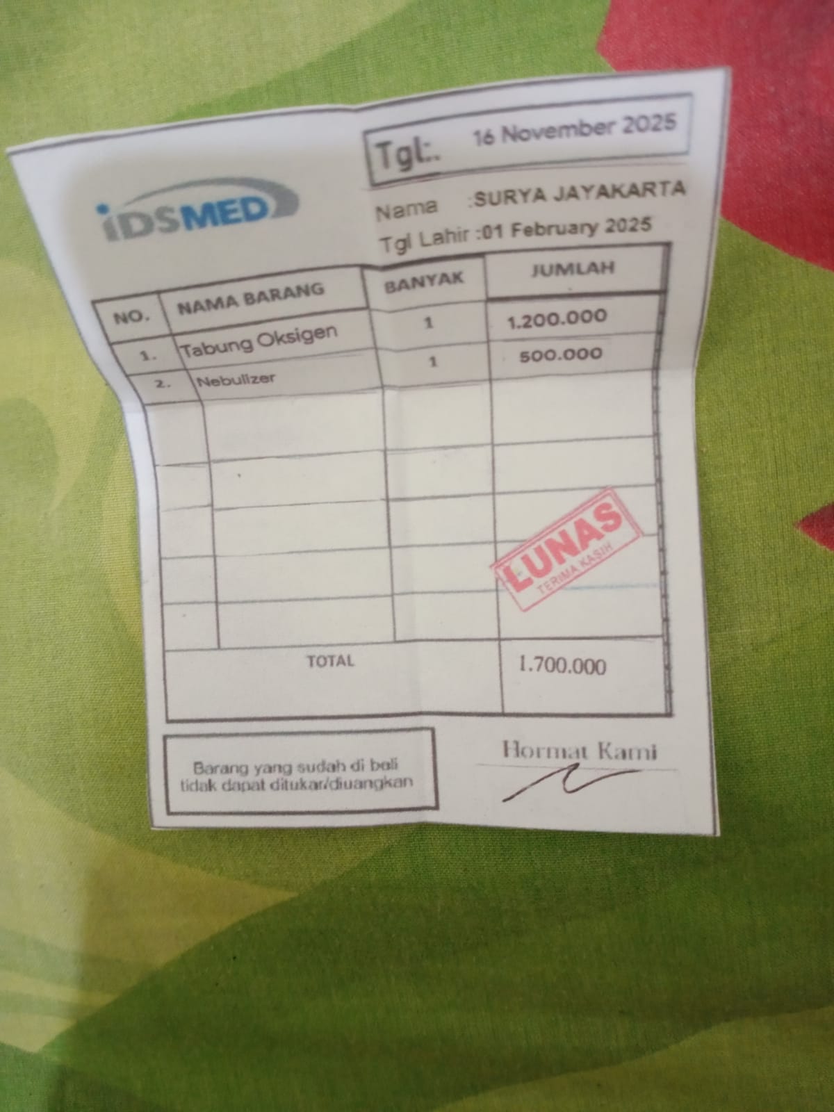 Dana digunakan untuk 1. Pampers 75.000 × 4 ball = Rp300.000 2. Compressor nebulizer Rp500.000 3. Tabung oksigen kcl 1set Rp1.200.000 4. Stroller Rp1.300.0002025-11-13 09:13:57