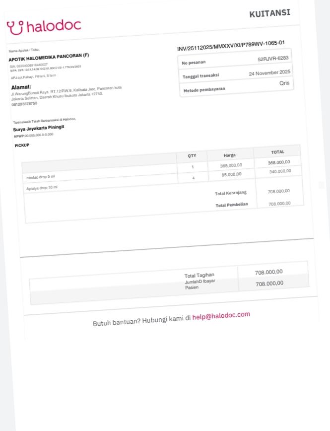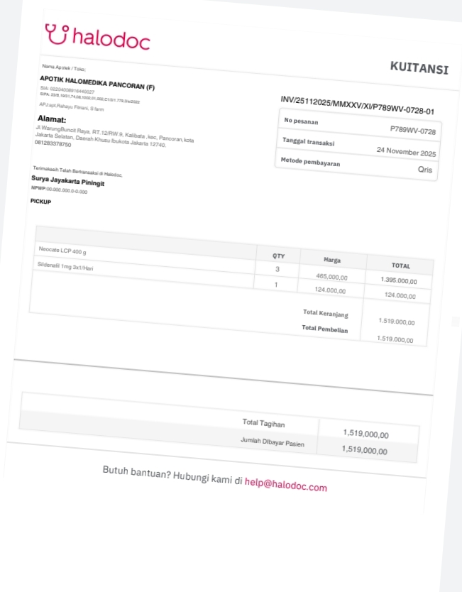 Dana digunakan untuk 1. Obat sildenafil Rp124.000 2. Obat Interlac prebiotik drop Rp368.000 3. Obat Aplyalis Rp340.000 4. Pulse oxinetri Rp500.000 5. Transportasil ke rmh sakit Rp100.000 6. Susu neocate 3kaleng Rp1.395.0002025-11-25 09:22:15