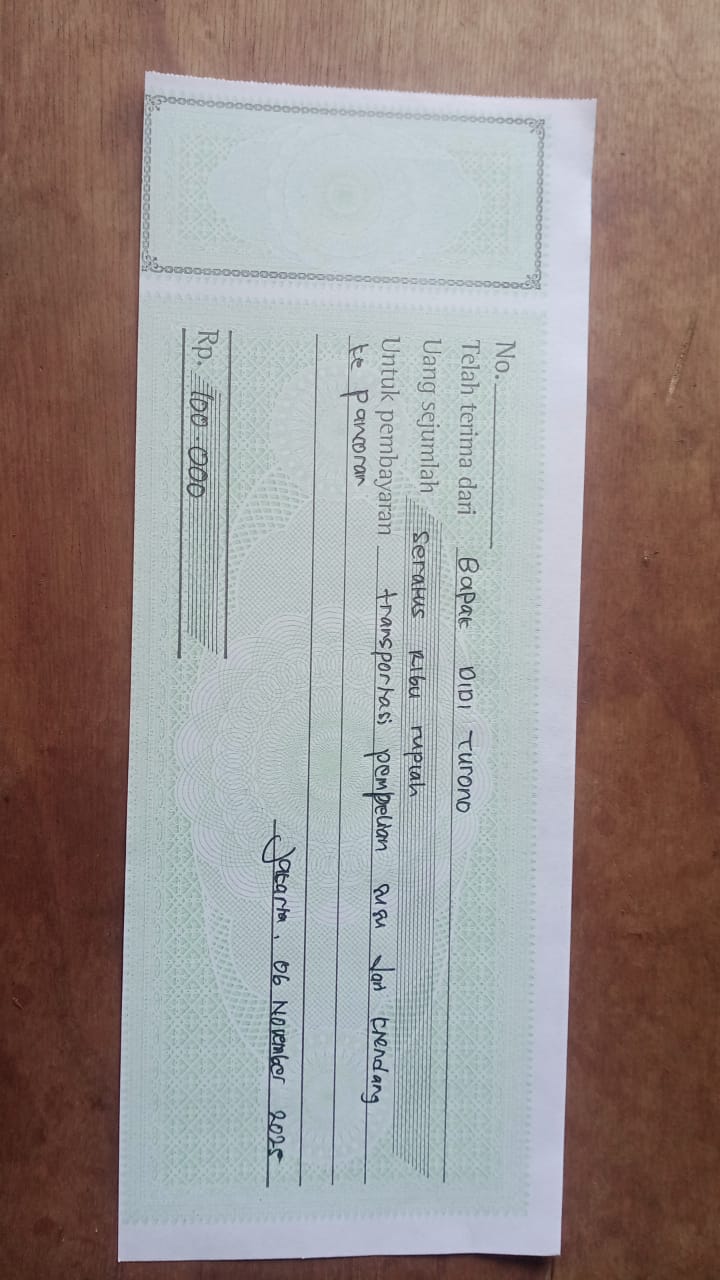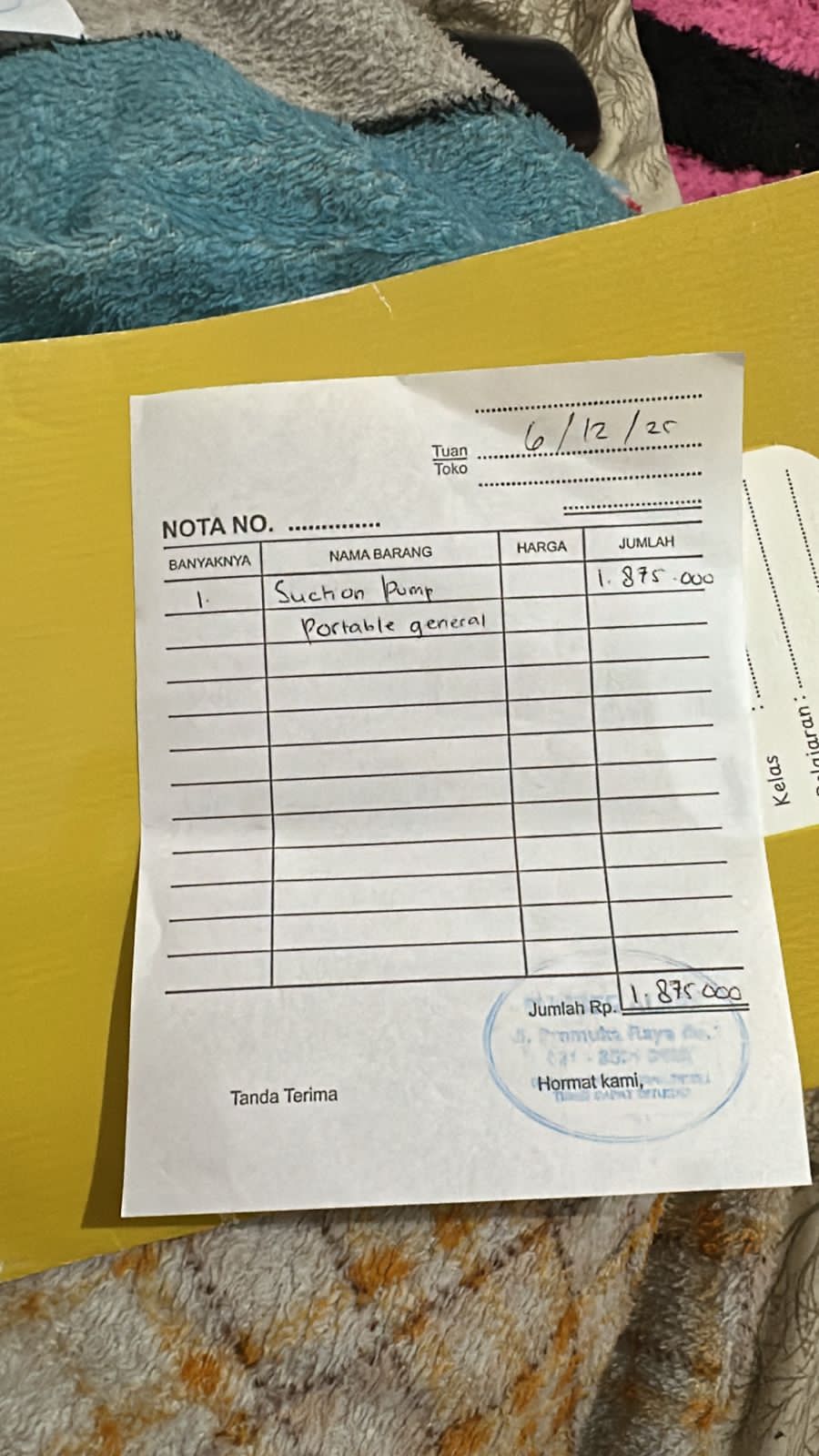 Dana digunakan untuk 1. Alat Suction portable Rp1.800.000 2. Oba Ventolin nebu Rp25.000 x 56 kali = Rp1.400.000 3. Tissue basah Rp12.000 x 4= Rp48.000 4. Tissue kering Rp12.000 x 4pack = Rp48.0002025-12-02 10:44:05