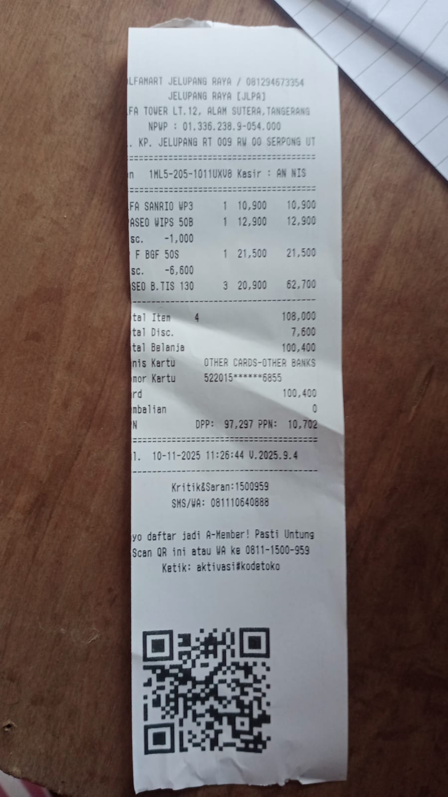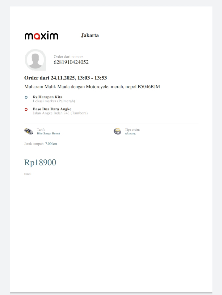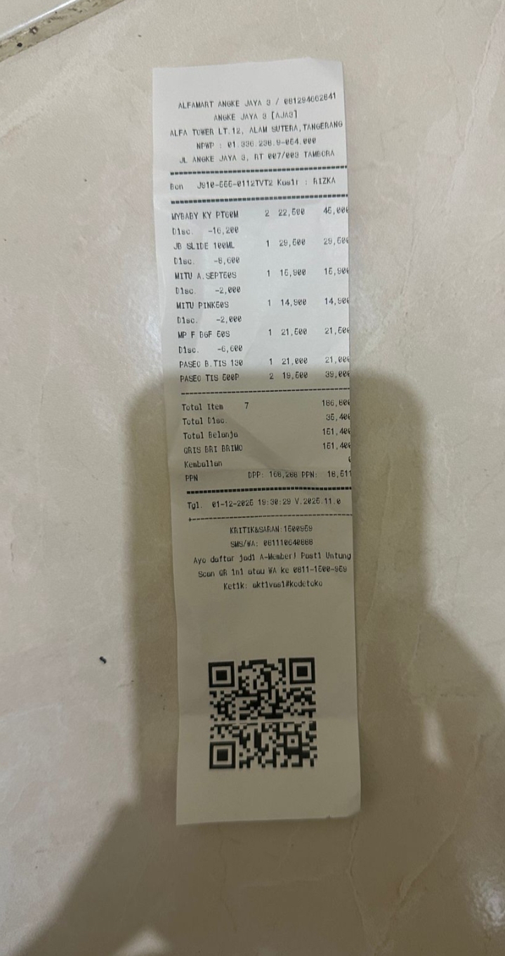 Pembelian air mineral (2 × Rp10.000): Rp20.000