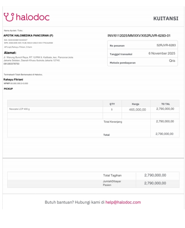 Pembelian susu Neocate 6 kaleng (untuk 3 minggu): Rp2.790.000