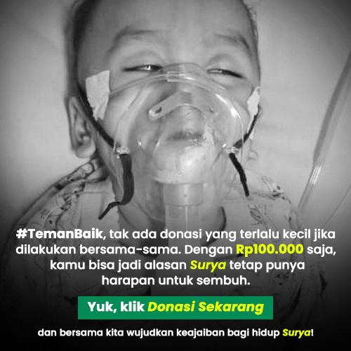 #TemanBaik, tak ada donasi yang terlalu kecil jika dilakukan bersama-sama. Dengan Rp100.000 saja, kita bisa jadi alasan Surya tetap punya harapan untuk sembuh. Yuk, klik Donasi Sekarang dan bersama kita wujudkan keajaiban bagi hidup Surya!