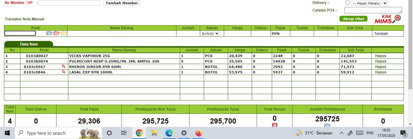 Dana digunakan untuk 1. Obat Vestein sirup Rp84.582 2. Obat Rhinos sirup Rp60.562 3. Sisanya digunakan untuk biaya transportasi bensin Rp33.000.2023-08-03 16:30:46