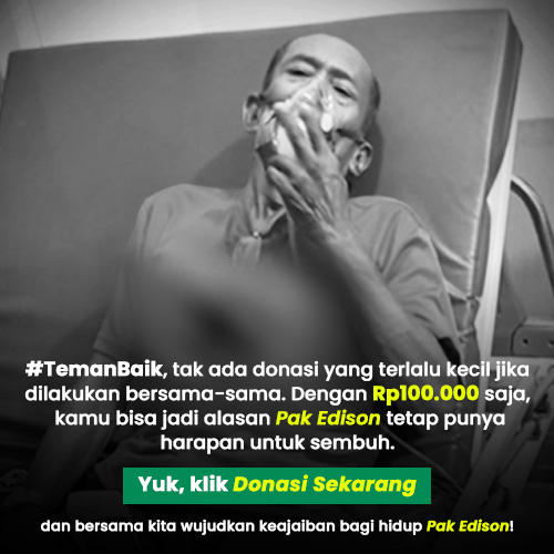 #TemanBaik, tak ada donasi yang terlalu kecil jika dilakukan bersama-sama. Dengan Rp100.000 saja, kita bisa jadi alasan Pak Edison tetap punya harapan untuk sembuh. Yuk, klik Donasi Sekarang dan bersama kita wujudkan keajaiban bagi hidup Pak Edison!