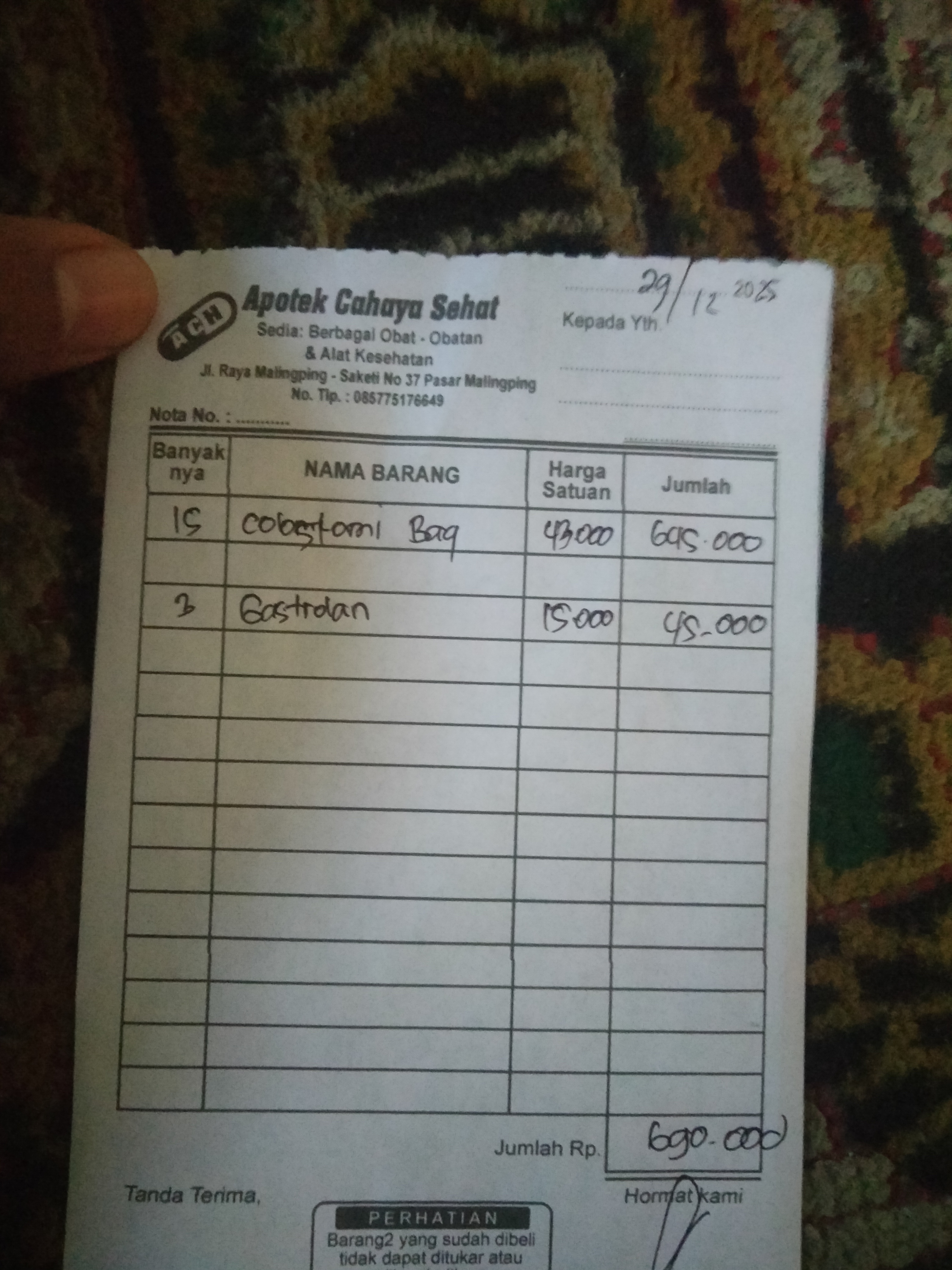 Dana digunakan untuk Kantong kolostomi 16 buah x Rp45.000= Rp720.0002025-12-30 10:32:37