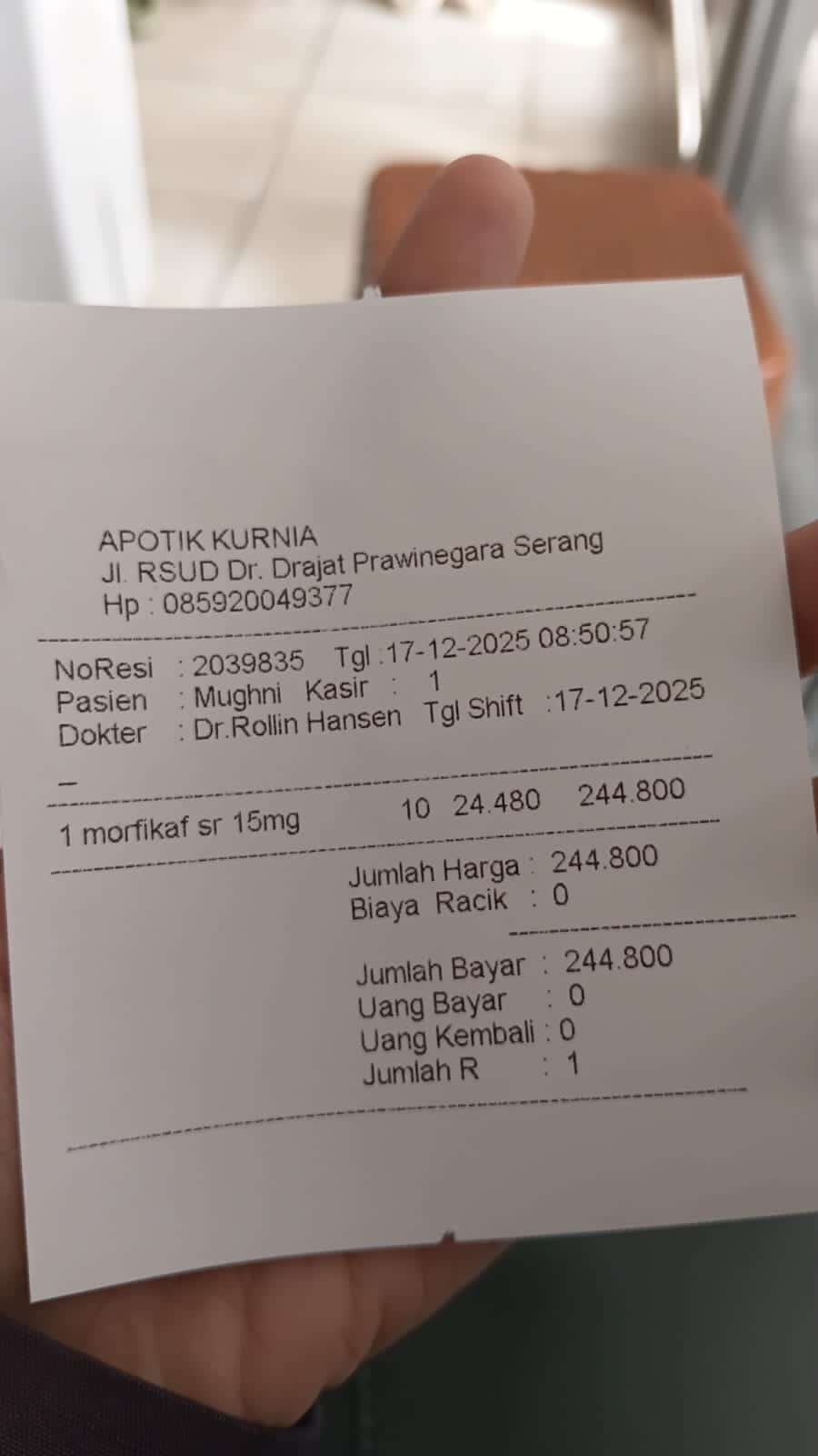 Dana digunakan untuk 1. Obat Morfikaf SR 15 mg 20 butir x Rp24.480= Rp489.600 2. Kantong kolostomi 9 biji x Rp30.000= Rp270.0002025-12-17 14:15:33