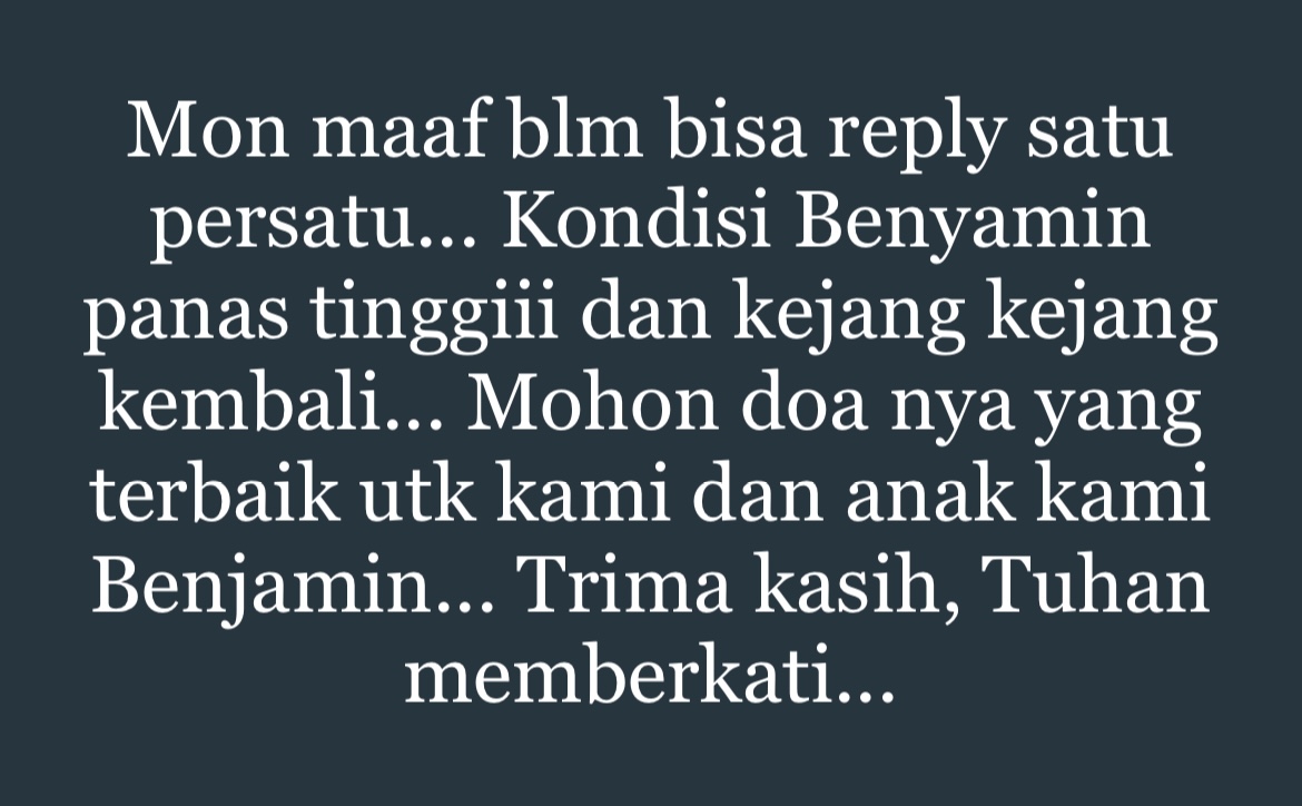 Hari ini kami dapat menginformasikan perkembangan Benjamin yang kemarin kembali drop namun kini kondisi Benjamin terus membaik dan pulih....Saat ini kondisi Benjamin sudah pulih namun masih harus dalam pengawasan untuk kesehatannya sehingga dapat beraktivitas dengan normal seperti anak lain...