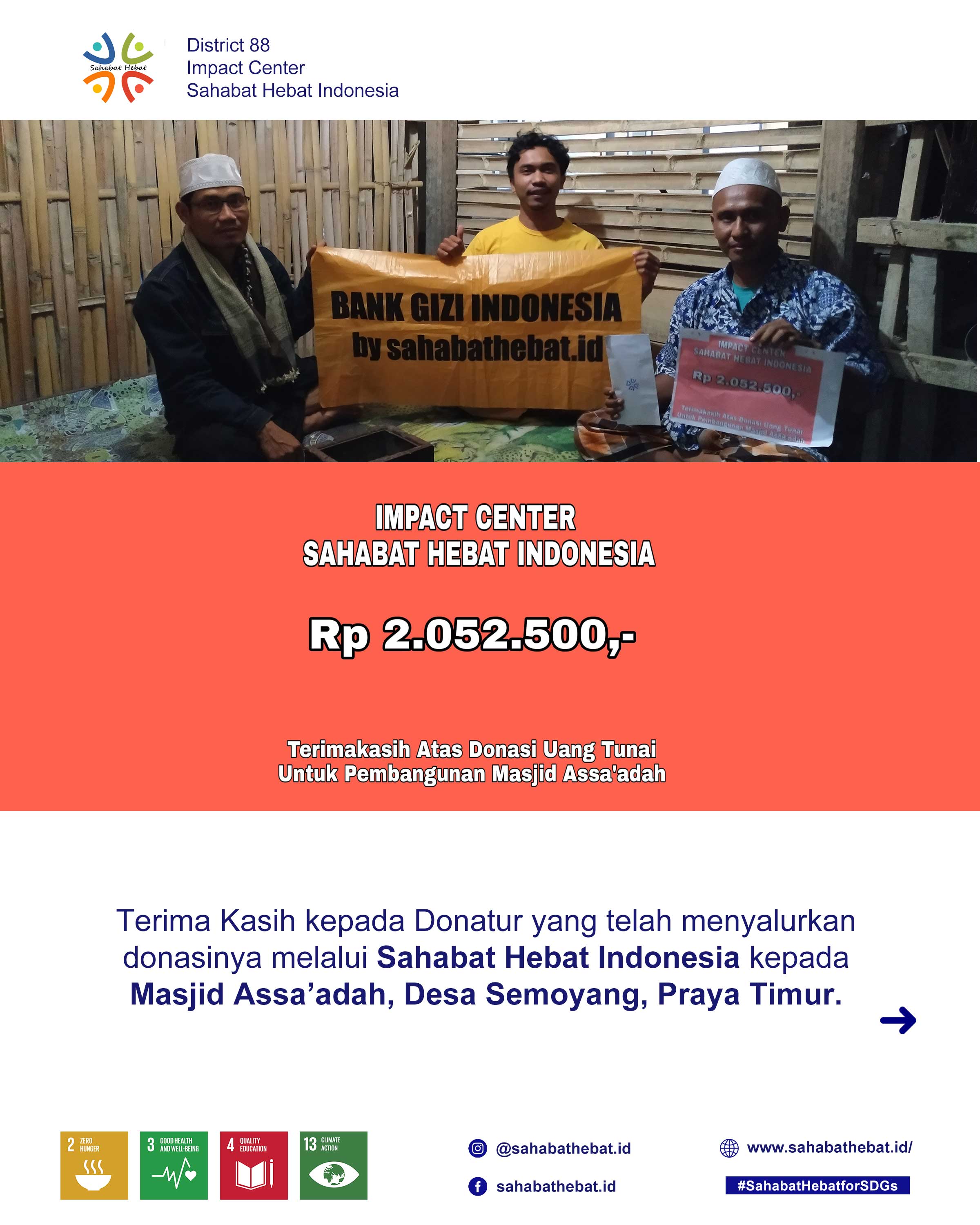 Alhamdulillah minggu ini kita telah menyalurkan donasi berupa uang tunai sebesar Rp 2.052.500,- untuk Pembangunan Masjid Assa'adah yang berlokasi di Dusun Batu Gulung, Desa Semoyang, Kecamatan Praya Timur, Kabupaten Lombok Tengah, NTB.