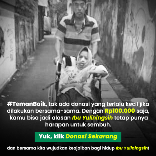 #TemanBaik, tak ada donasi yang terlalu kecil jika dilakukan bersama-sama. Dengan Rp100.000 saja, kita bisa jadi alasan Ibu Yuliningsih tetap punya harapan untuk sembuh. Yuk, klik Donasi Sekarang dan bersama kita wujudkan keajaiban bagi hidup Ibu Yuliningsih!