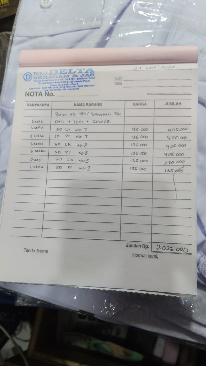 Dana digunakan untuk 1. Seragam SD (dasi, topi, gesper) Rp135.000 x 16 pasang = Rp2.160.000 2. Seragam pramuka (kacurung, topi, gesper) Rp160.000 x 16 pasang = Rp2.560.000.2025-05-02 10:07:12
