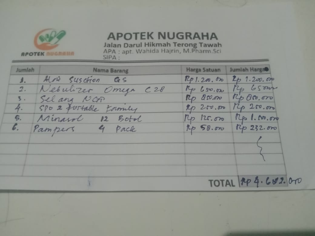 Dana digunakan untuk 1. Alat susction GS Rp1.200.000 2. Nebulizer Omega C28 Rp 650.000 3. Selang NGT Rp 850.000 4. Spo 2 fortable family Rp 250.000 5. Obat Minasol Rp125.000 × 12 = Rp1.500.000. 6. Pampers Rp58.000 × 4 = Rp232.000.2025-04-28 13:58:50