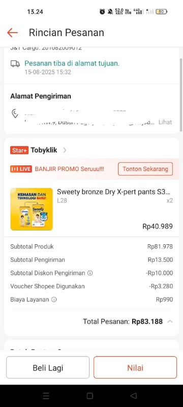 Dana digunakan untuk 1. Pampers sweety Rp44.900 x 3 ball = Rp134.700 2. Tisu basah Rp12.700 x 2 pcs = Rp25.4002024-12-09 13:18:33