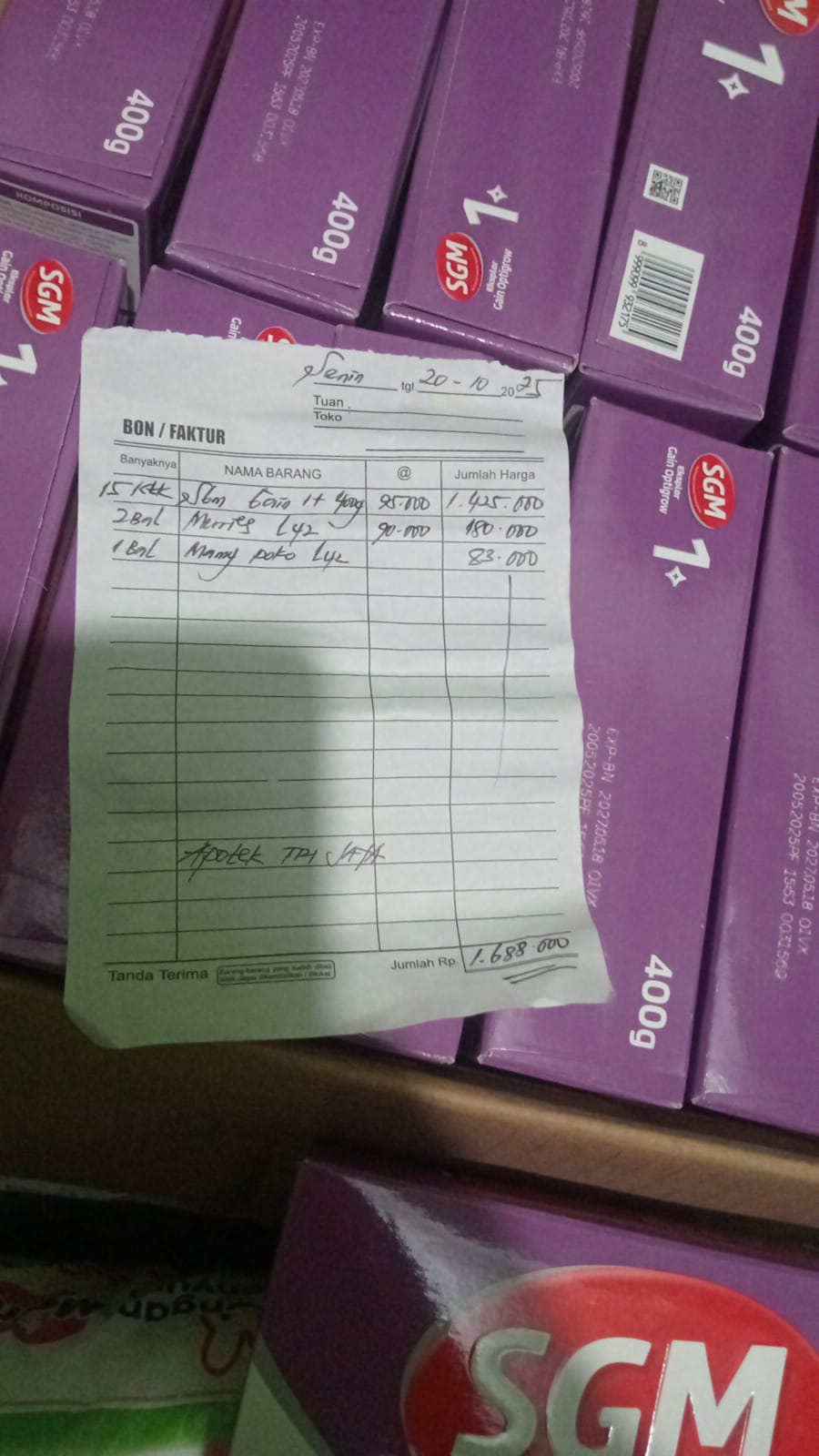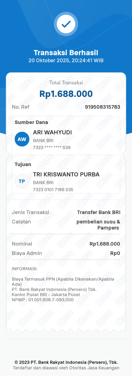 Dana digunakan untuk 1. Susu SGM explor gain 400gr Rp95.000x 15 kotak= Rp.1.425.000. 2. Pampers merries Rp75.000 x 3 ball= Rp225.000 3. Transportasi ke RS terapi PP Rp150.000 x 6 kali = Rp850.0002025-10-21 10:32:22